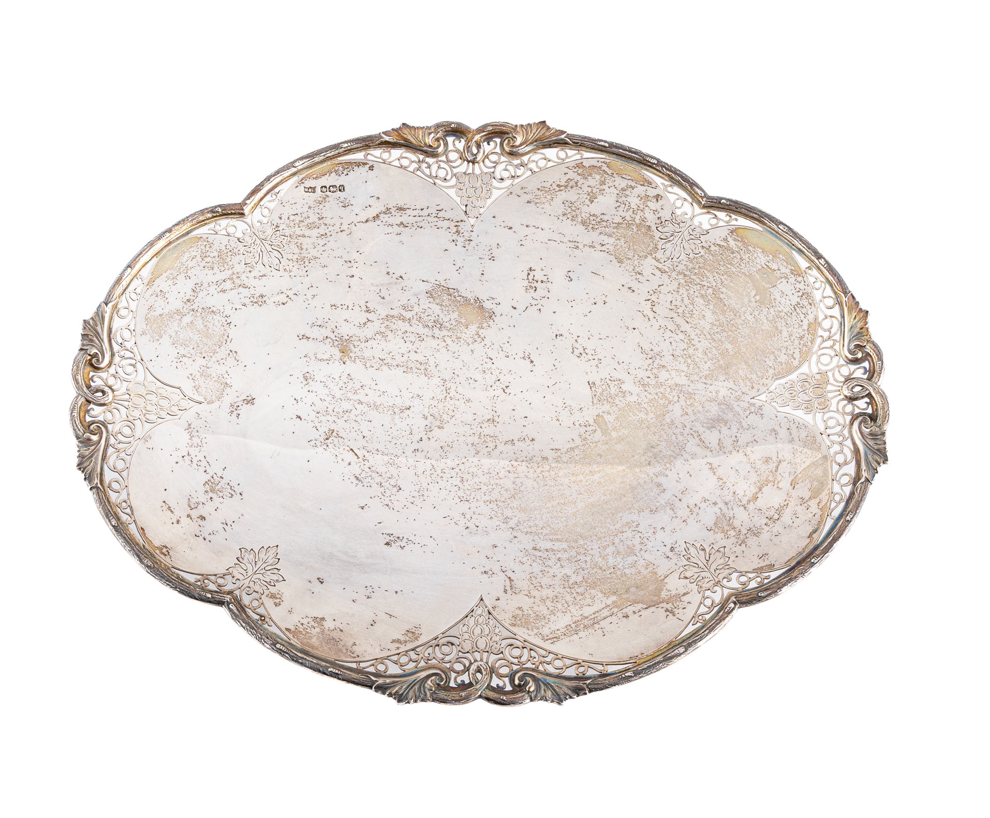 Mappin & Webb, alzata in argento, Inghilterra, XX secoloAlzata in argento di forma ovale impreziosita da un bordo rialzato decorato a traforo con motivi a grappolo d'uva e voluteFirmata Mappin & WebbGr 663Dimensioni 31 x 23 x 5 cm