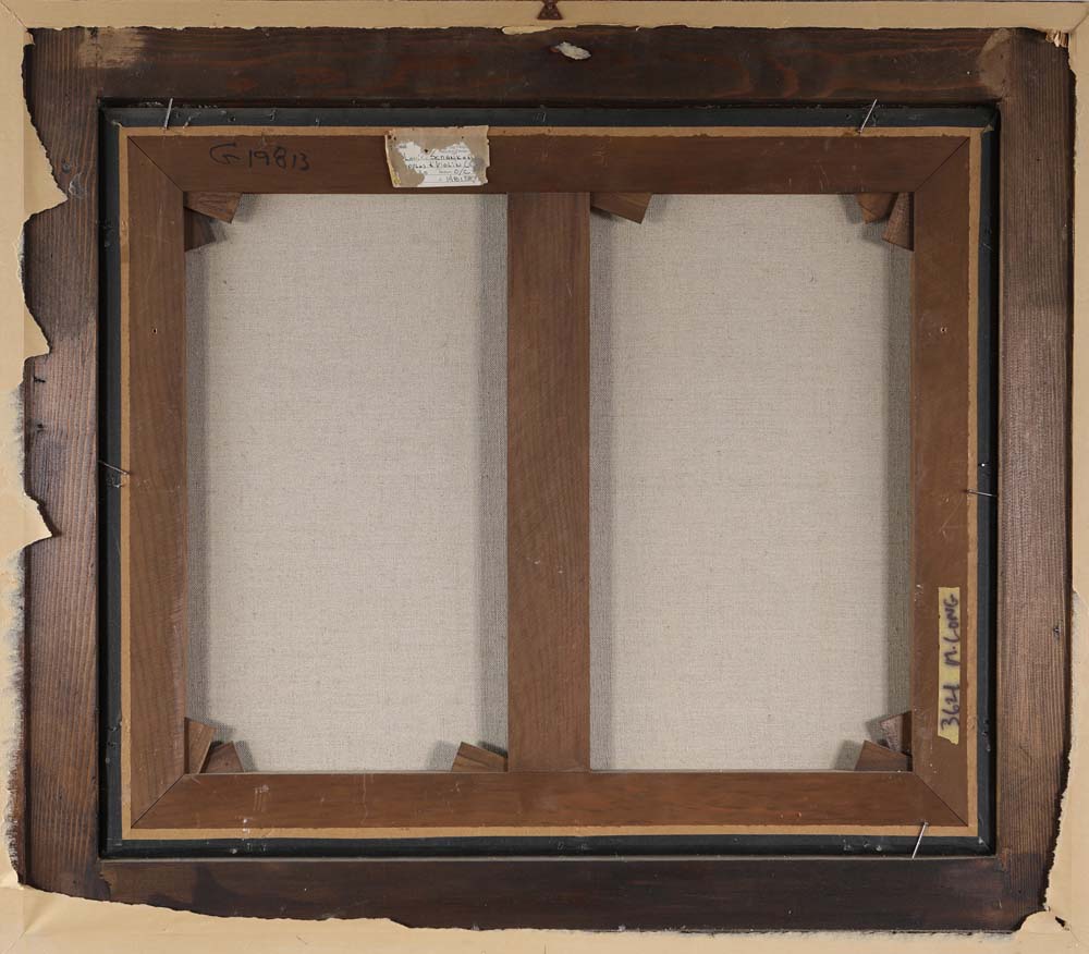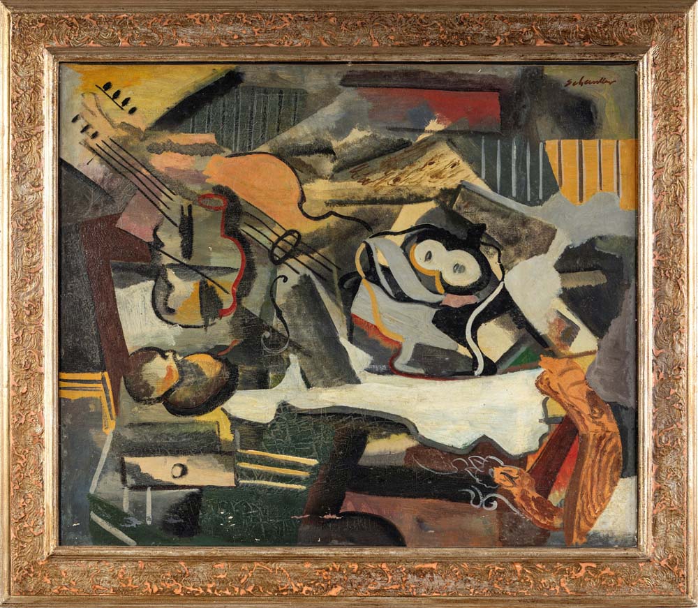 Natura morta con frutta e violoncello Firma in alto a destra "Schanker". Al verso etichetta parzialmente visibile "Houston Texas" Olio su tela cm 65x77 - in cornice cm 81x93