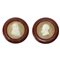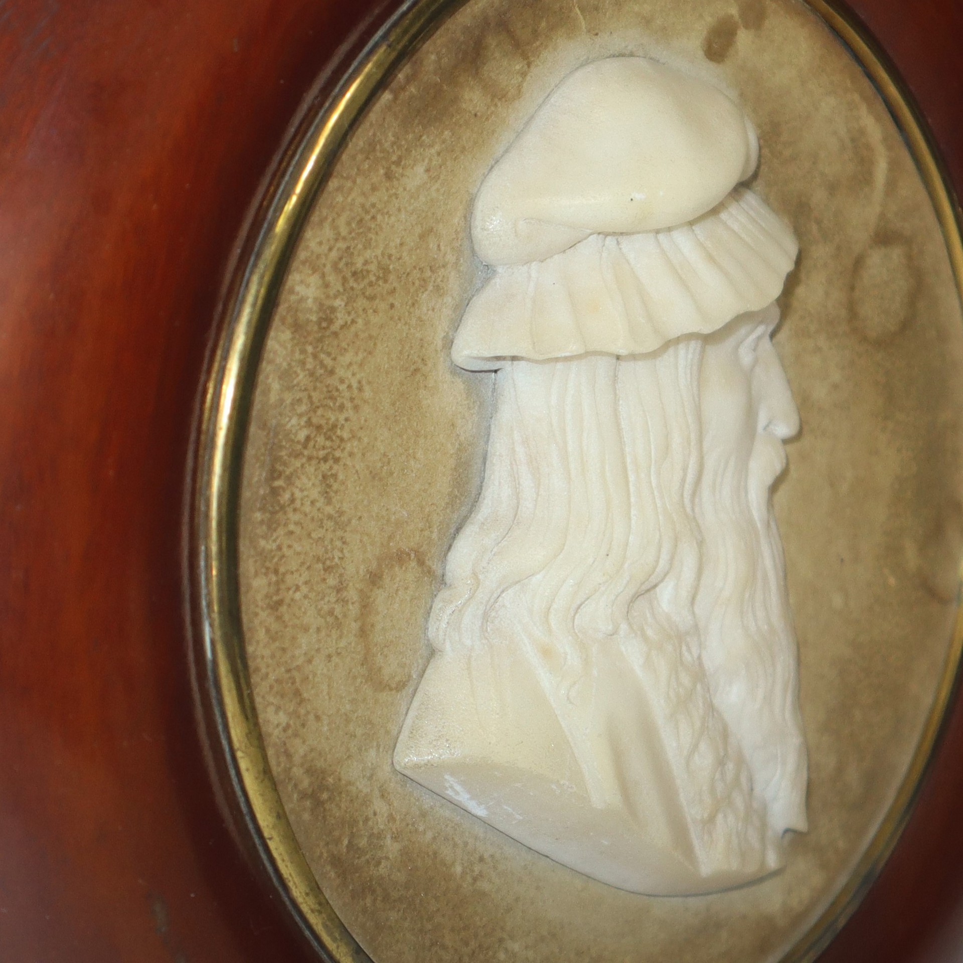Coppia di placche rotonde in cornice di legno con perfili in oro al centro bassorilievo in alabastro di Leonardo da Vinci e Michelangelo Buonarroti, fine 19° secolo