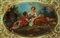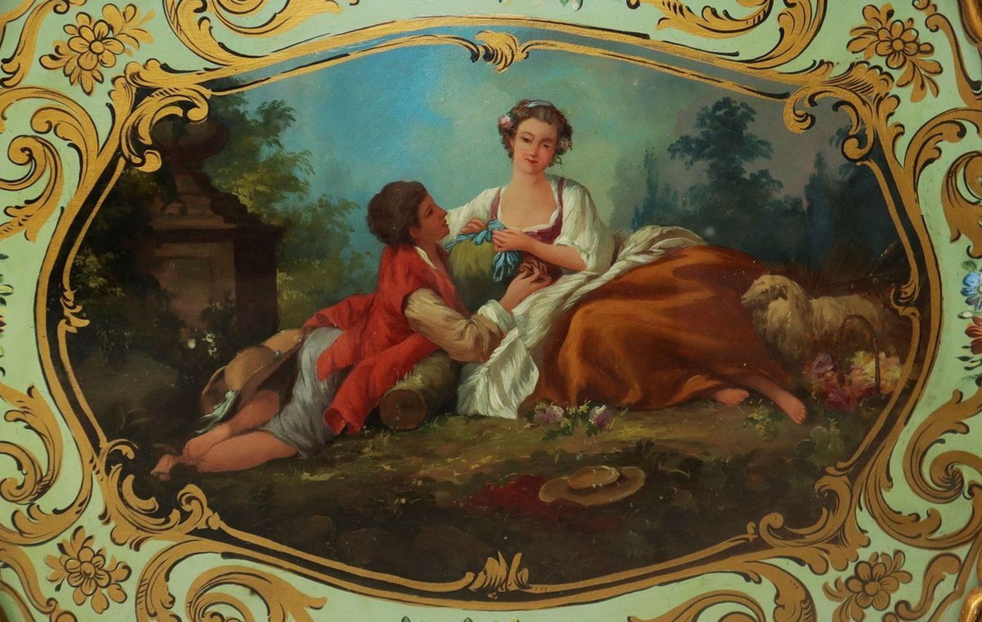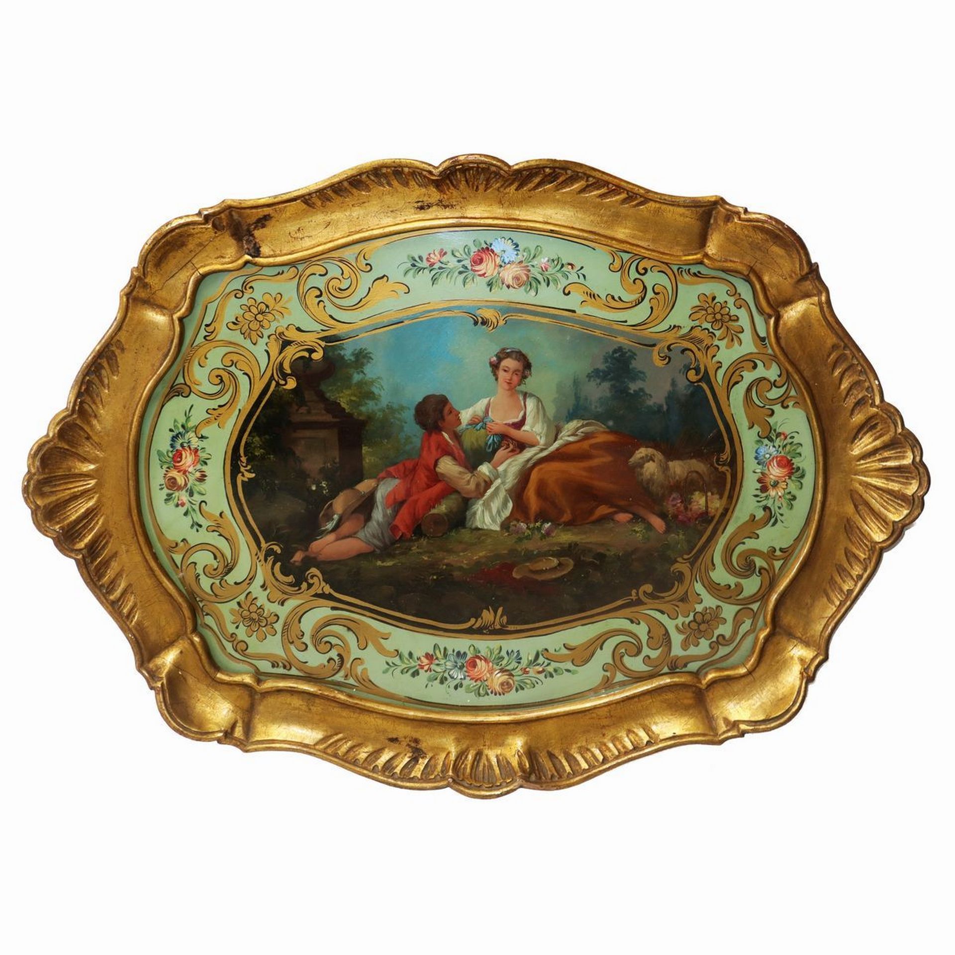 Vassoio con bordo in legno dorato e piano in legno dipinto con scene di genere, 19° secolo