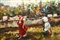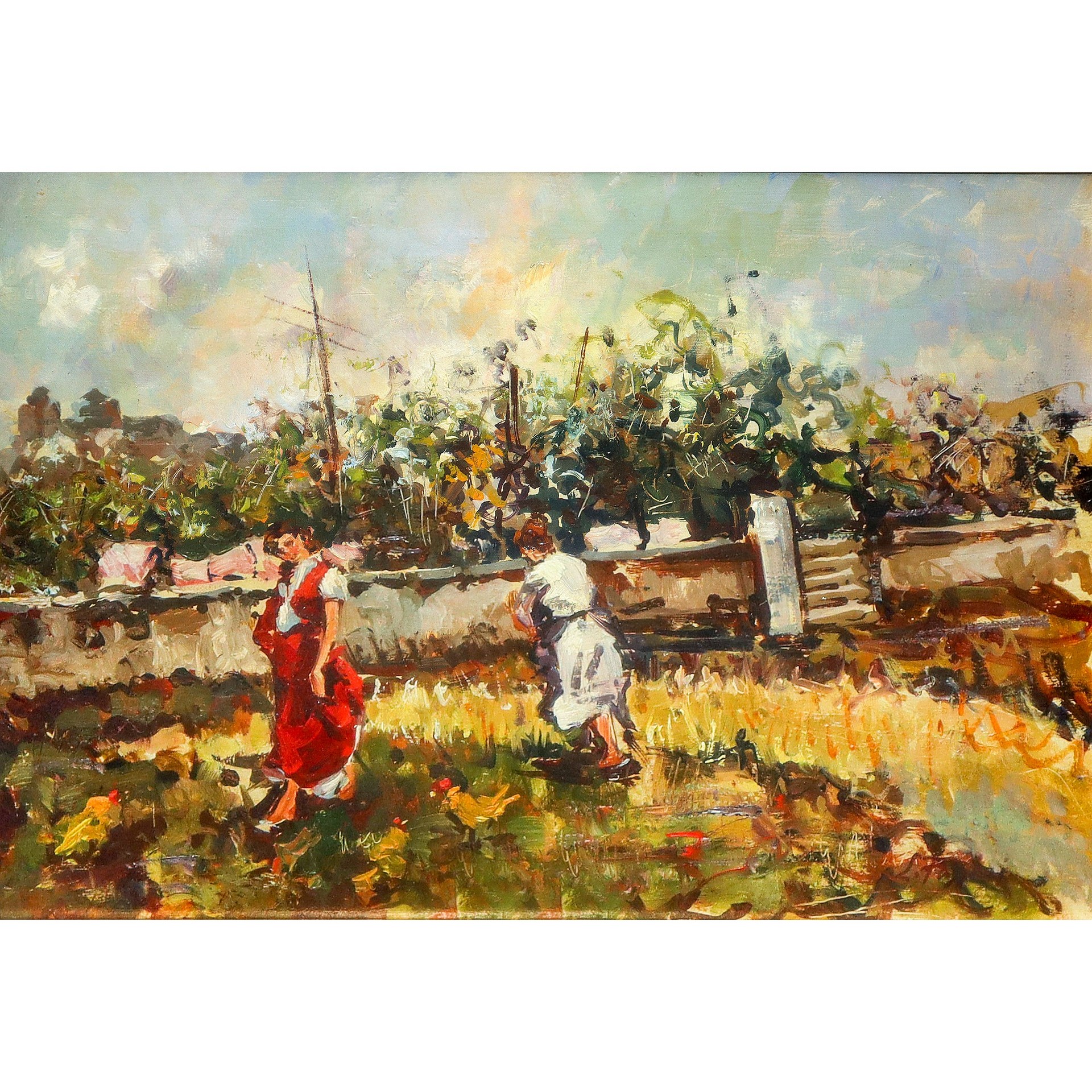 Donne nell'aia h cm 24X34 in cornice h cm 55X65 olio su tavola