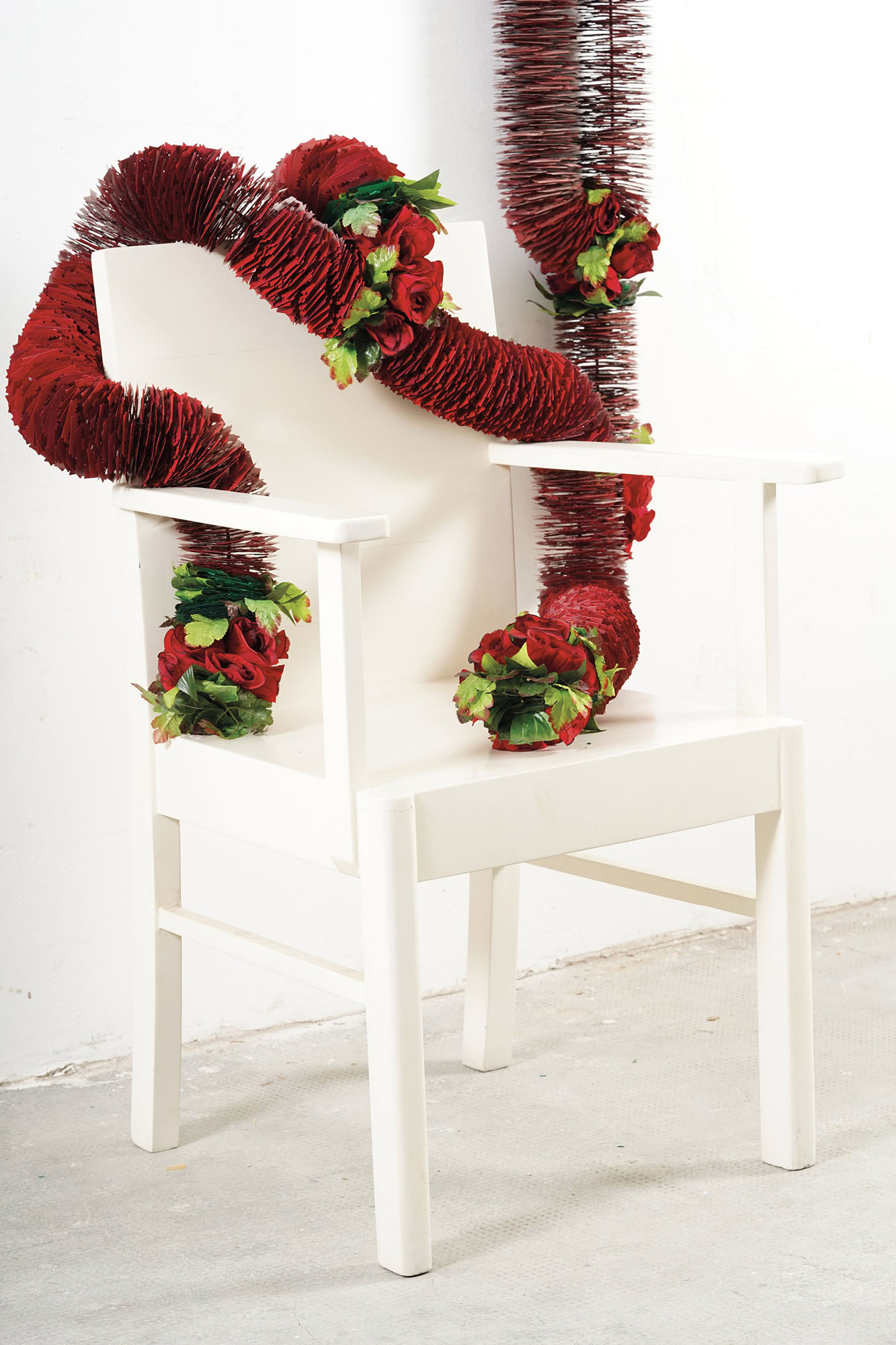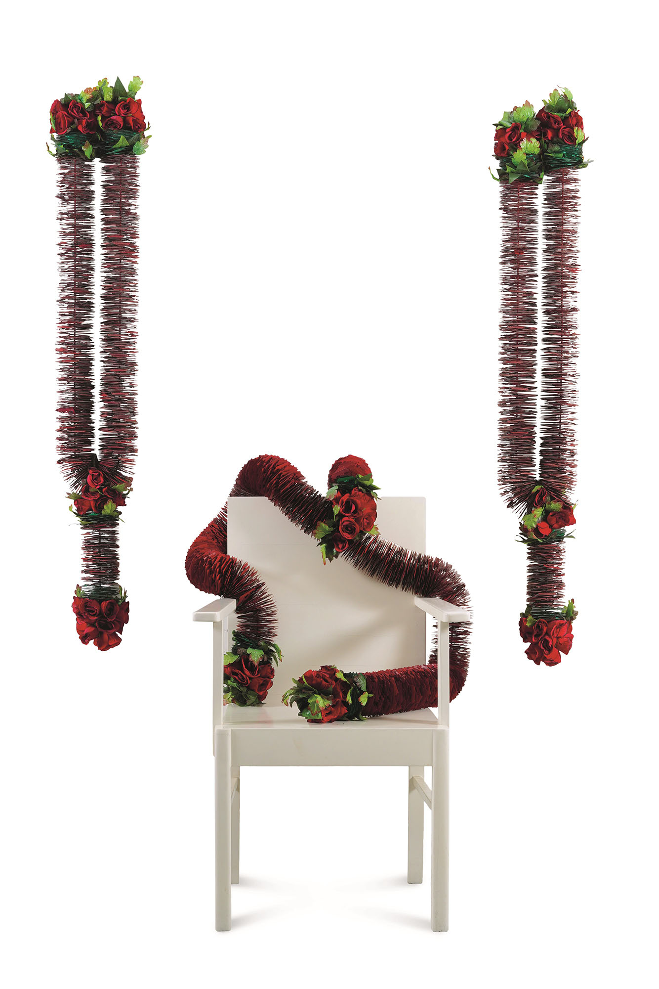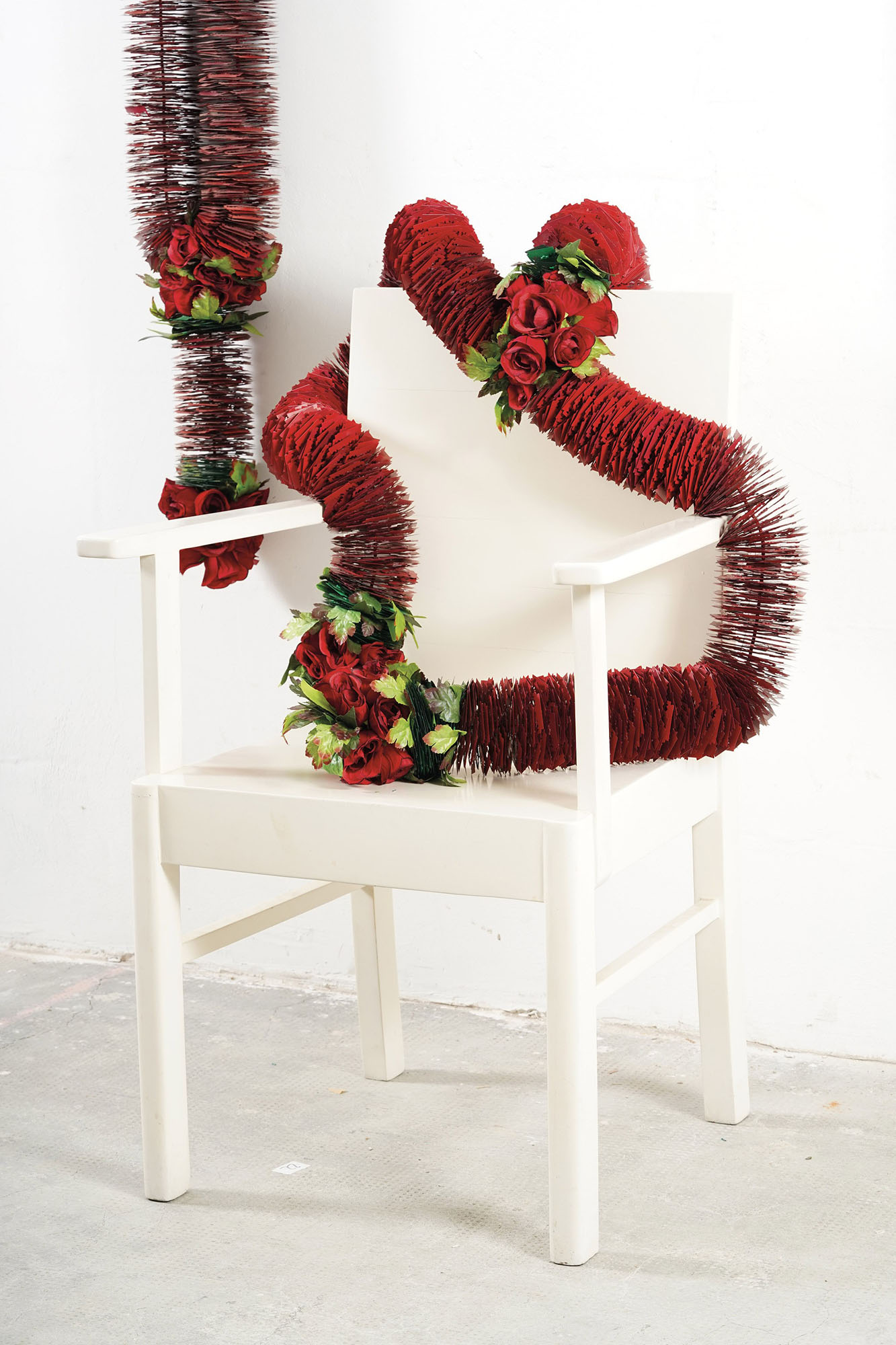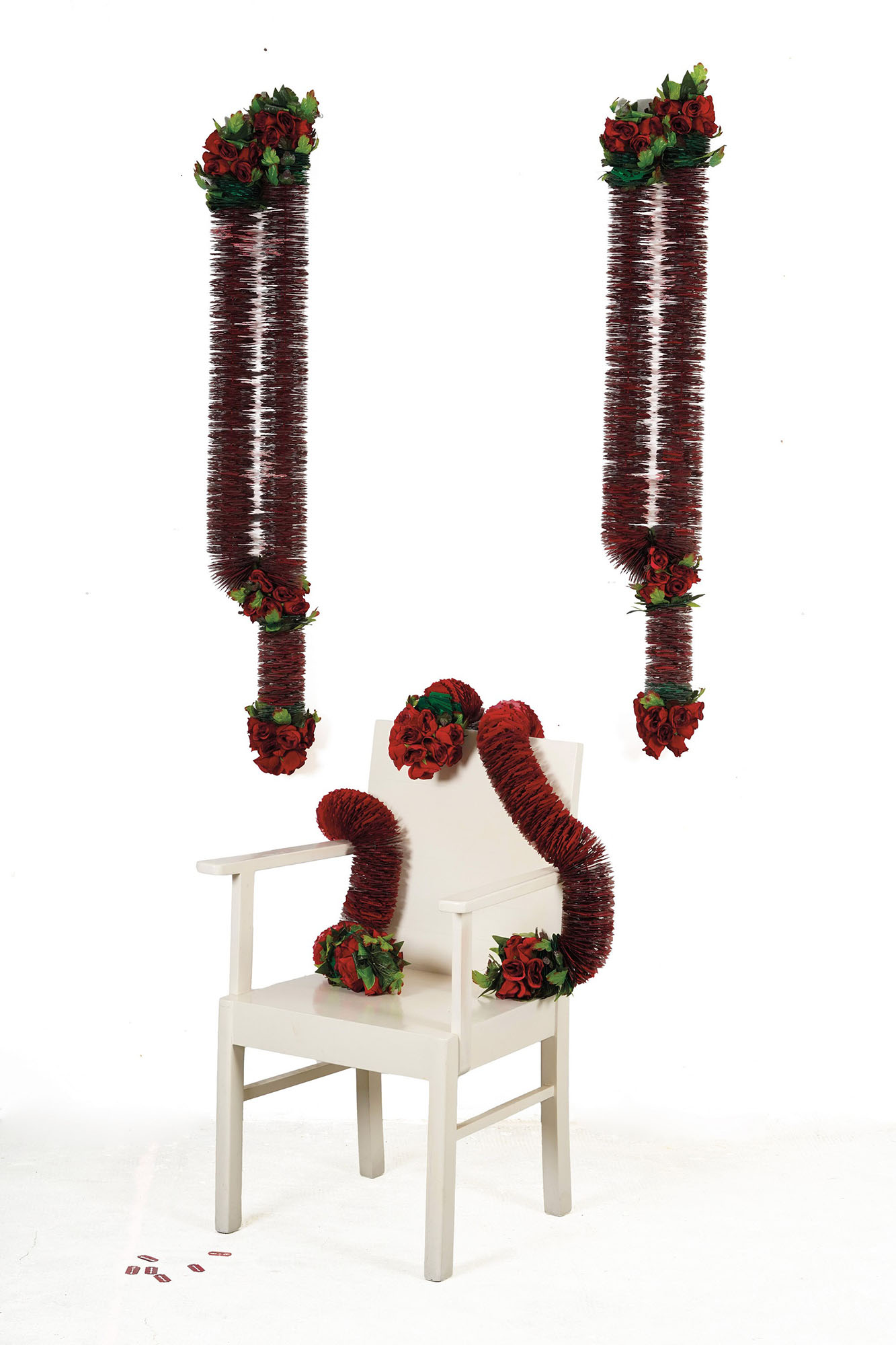 installazione composta da lame di rasoio, 3 ghirlande con rose artificiali e cavi d'acciaio e sedia in legno