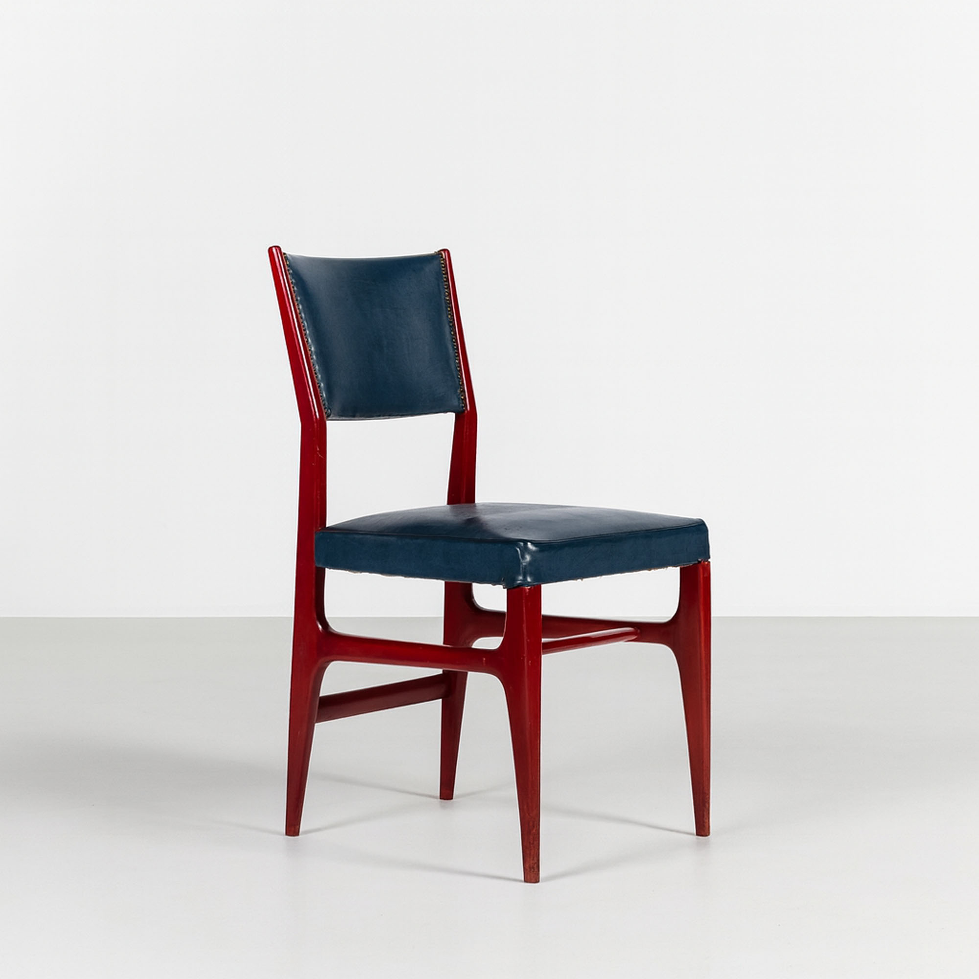 Coppia di sedie in legno di frassino, sedile e schineale imbottiti rivestiti in vinilpelle, produzione Cassina, Italia, 1951 circa