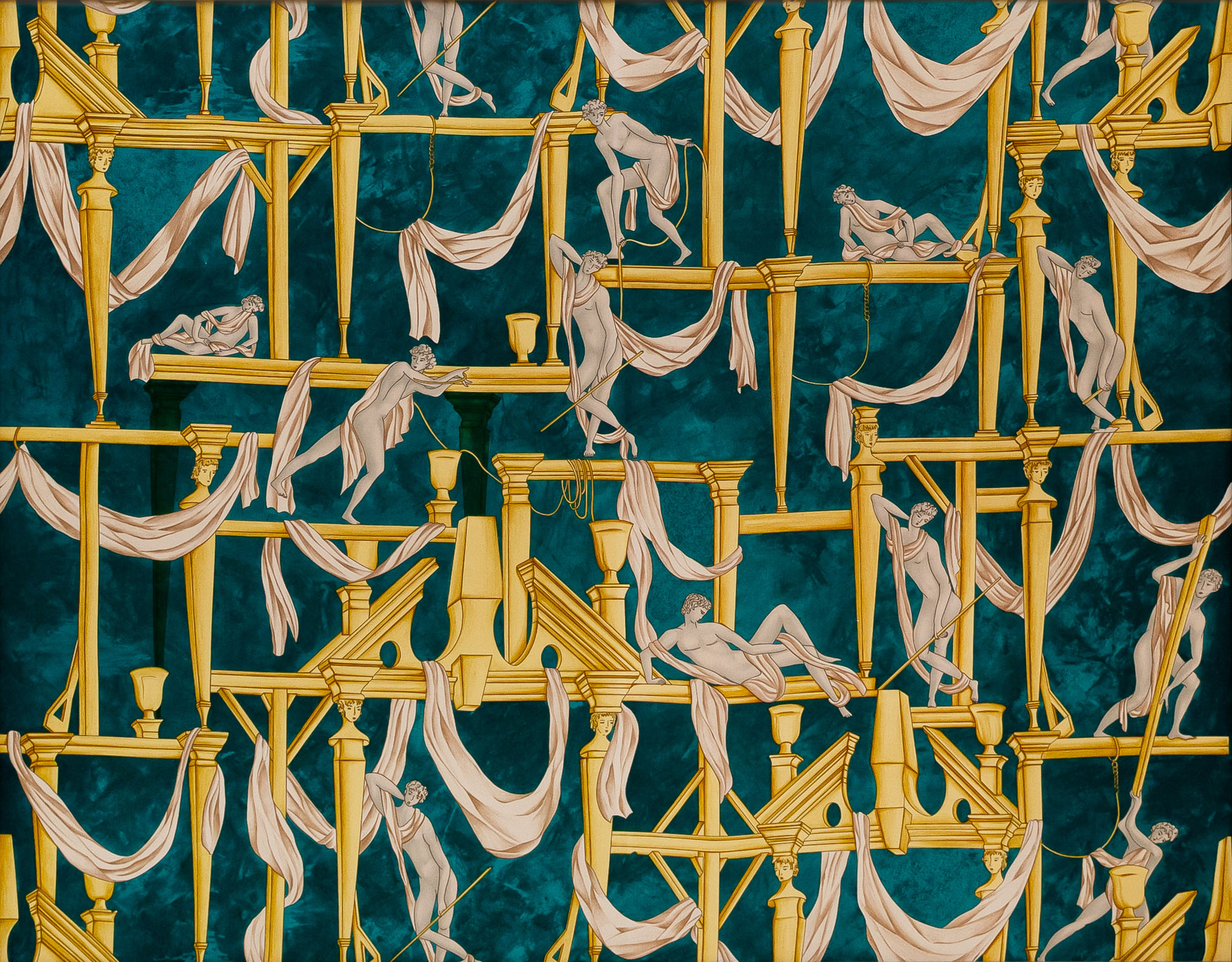 Tessuto stampato con motivi architettonici e figurativi di Giò Ponti, produzione Avigdor, Italia, seconda metà secolo XX