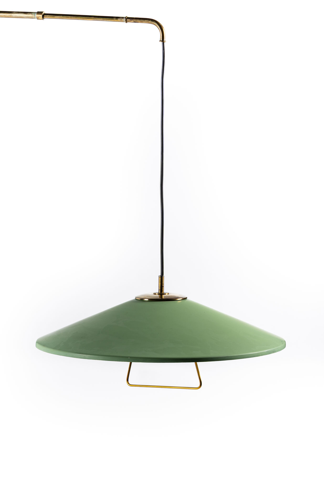 ANGELO LELLI(1915 - 1987)Lampada telescopica a pareteStruttura telescopica in ottone; riflettore in alluminio verniciato verde; contrappeso, produzione Arredoluce, Monza, 1948 circaDimensione minima: 68,5 cm circaDimensione massima: 128 cm circaDiametro: 47,5 cm circaPROVENIENZA:Collezione privata, NovaraBIBLIOGRAFIA:A. Pansera, A. Padoan, A. Palmaghini, Arredoluce. Catalogo ragionato 1943-1987, Silvana Editoriale, 2018