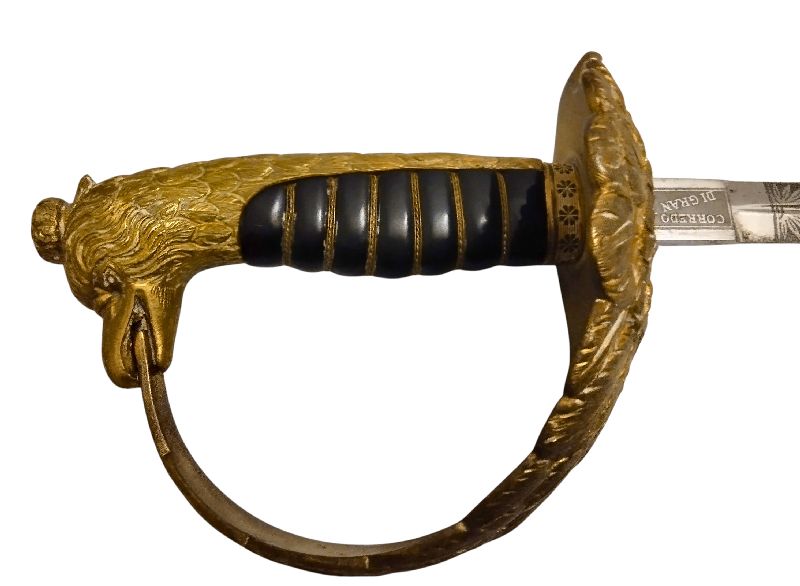 Bellissima spada per alta uniforme da ufficiale della Regia Aeronautica, impugnatura ed elsa in fusione di bronzo, fodero di cuoio nero con applicazioni metalliche dorate. La spada, in quanto oggetto di rappresentanza e non da guerra, è priva di filo e punta. In ottimo stato.