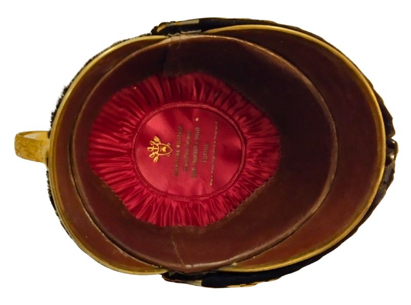 Bellissimo elmo da ufficiale di cavalleria, coppo in metallo argentato, cimiero e soggoli in metallo dorato,turbante con pelo integro, interno di seta cremisi con marchio del fabbricante, in ottimo stato.