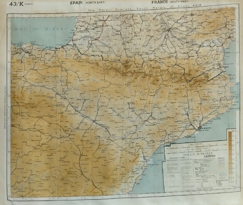 In scala 1 : 1'000'000, caratteristica cartina topografica utilizzata dai piloti della RAF che usavano metterla all'interno del giubbotto di volo. La cartina, in questo caso, rappresenta Francia, Spagna e Portogallo.