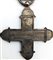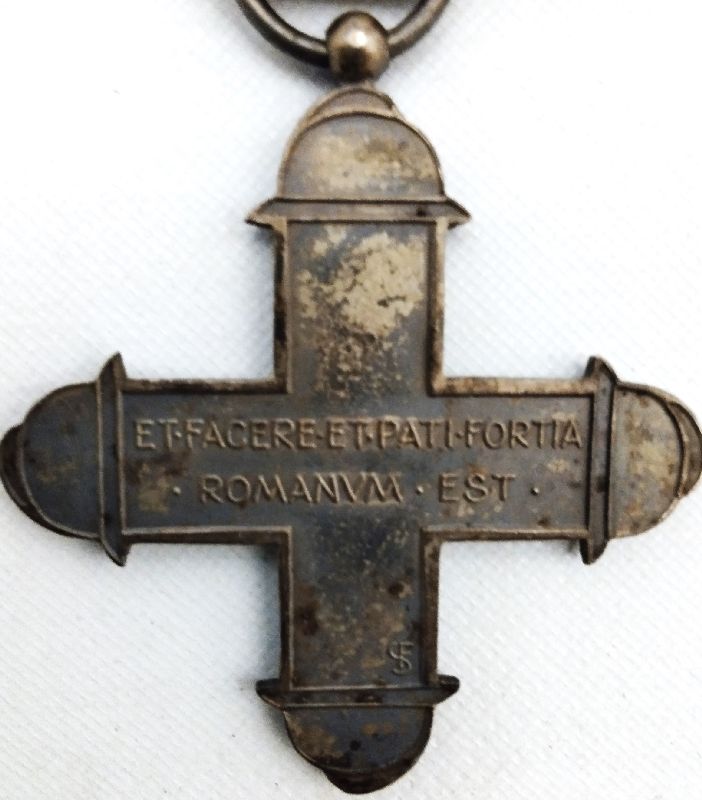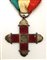 Croce in metallo argentato e smalto rosso, leggere ossidazioni al metallo, al verso senza smalto con marchi del fabbricante, nastro coevo.