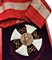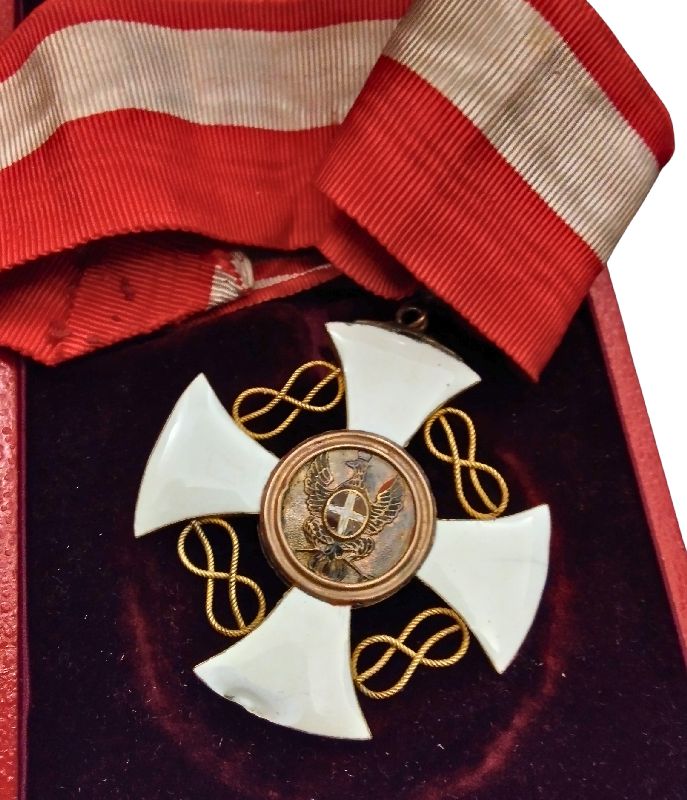 Insegna di Commendatore, periodo Umbertino, argento dorato e smalti, nastro coevo, conservata in astuccio con monogramma del sovrano regnante; in buono stato, smalti integri.