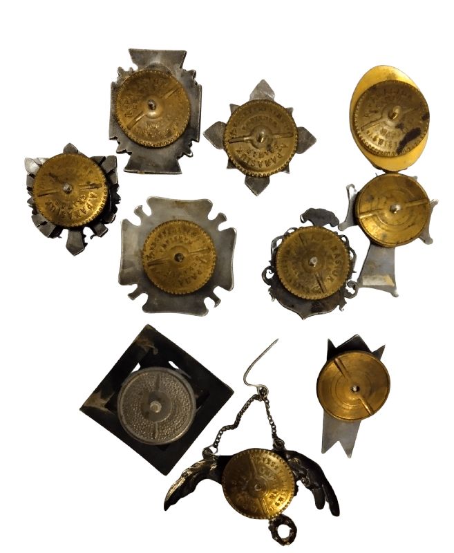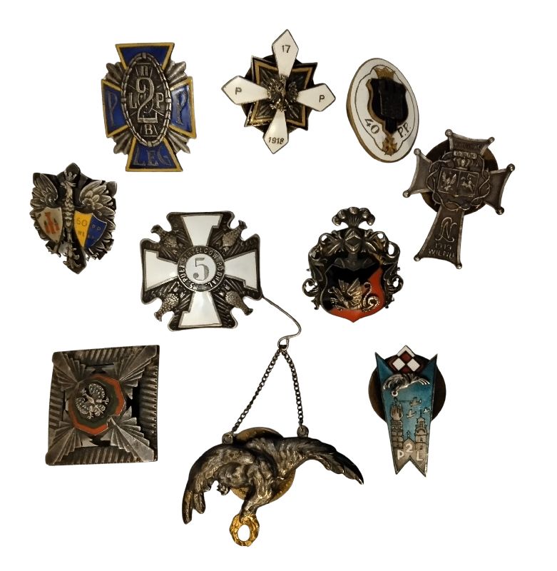 Lotto di dieci distintivi reggimentali, prevalentemente prodotti dalla ditta Panasiuk di Varsavia, metallo dorato e smalti policromi, al verso vite centrale e rondella con marchi del fabbricante, in ottimo stato.