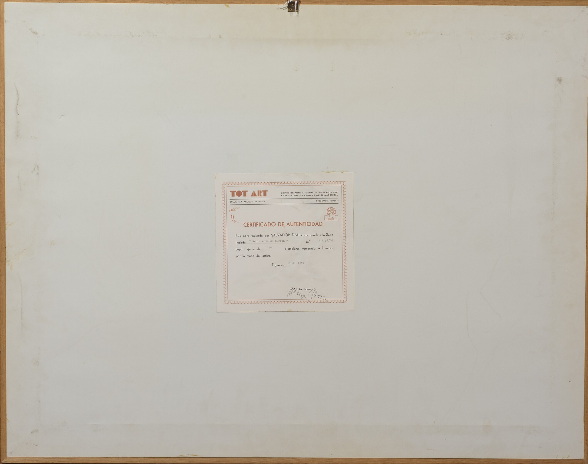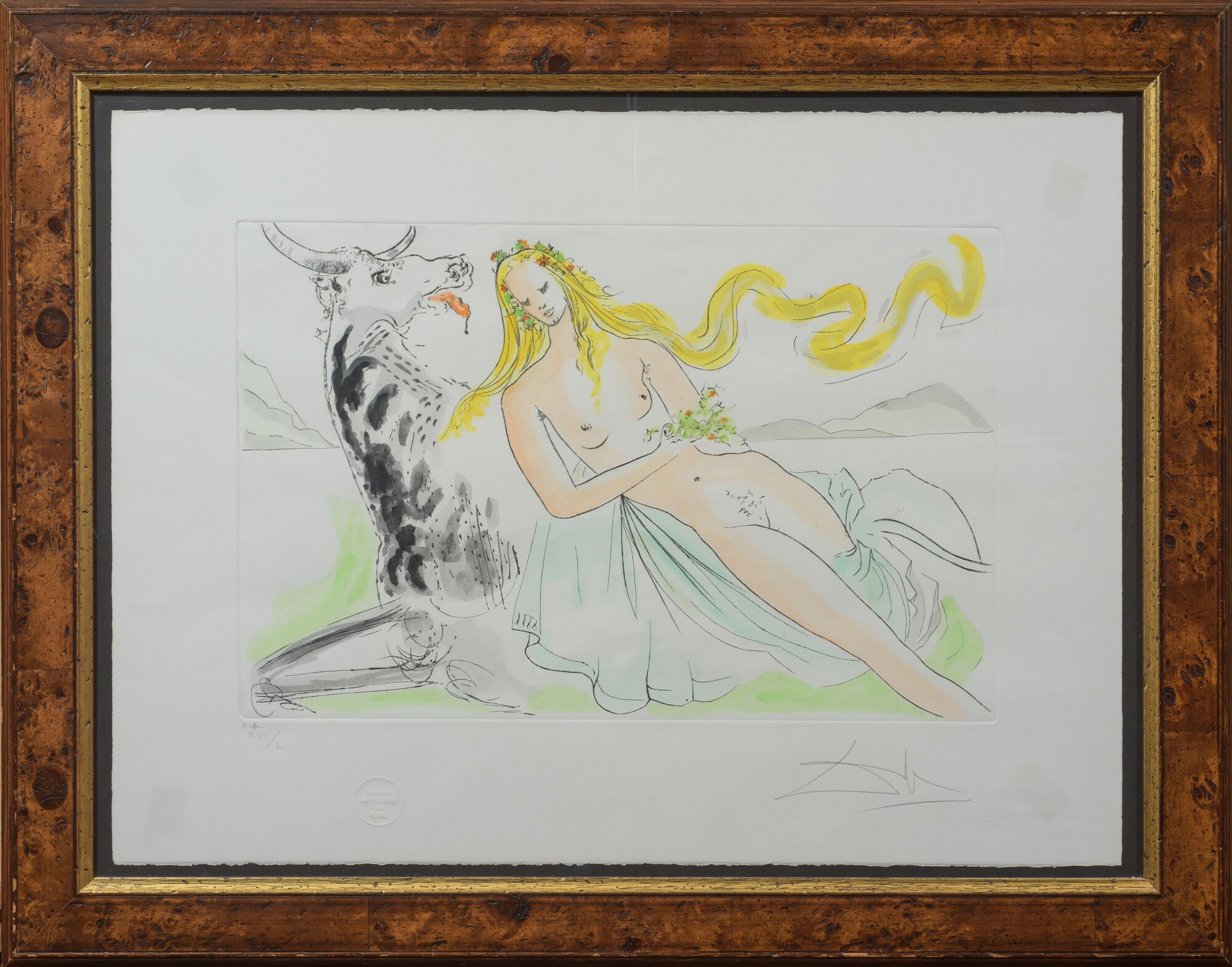 Es. E. A. n. XVII/L, su carta BFK Rives France. Timbro a secco "Graveur authentique de S. Dalì". Numerata e firmata in grafite. Dimensioni lastra: 37 x 57 cm. Al retro recante etichetta di autenticità della Galleria Tot Art di Figueres. In cornice.