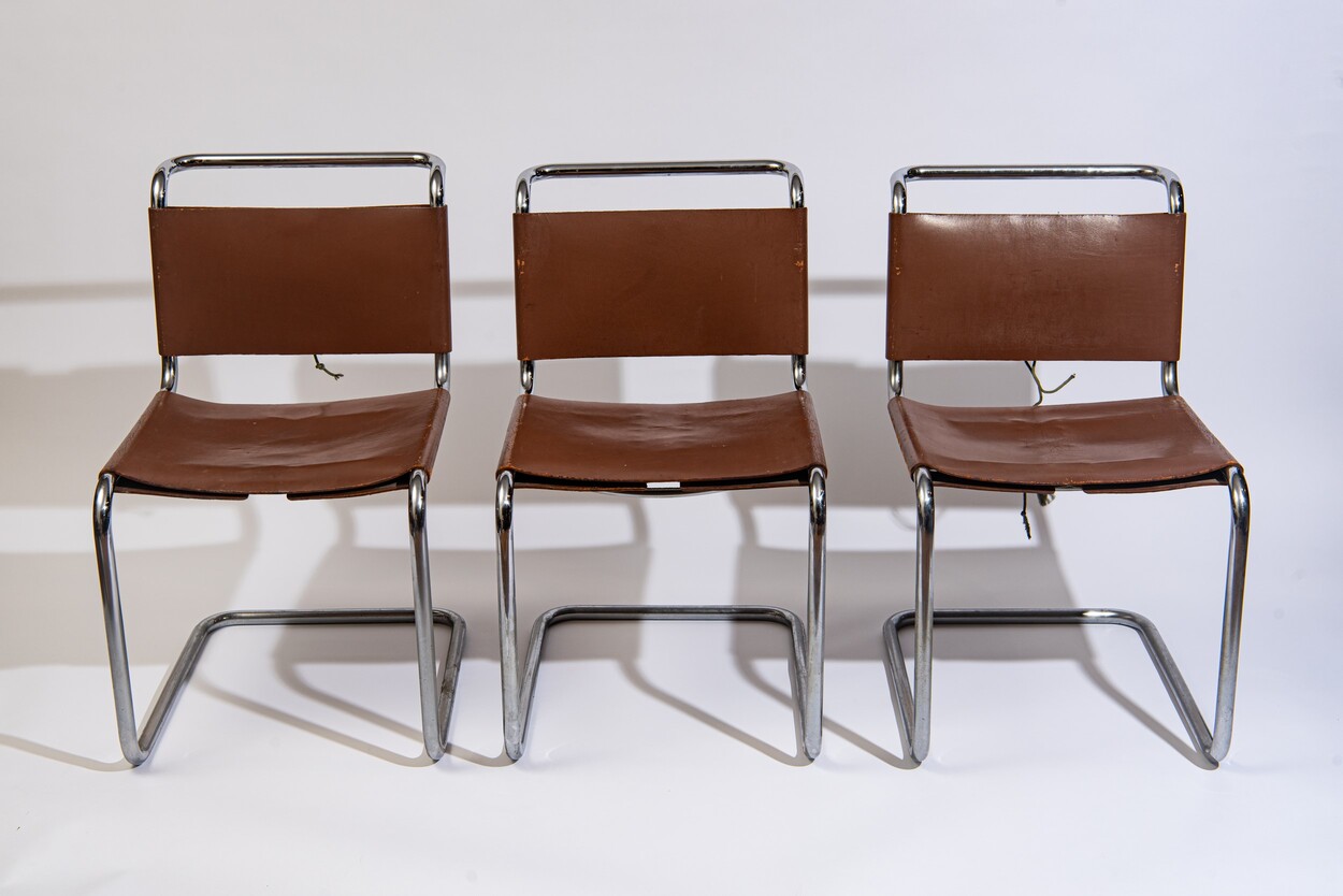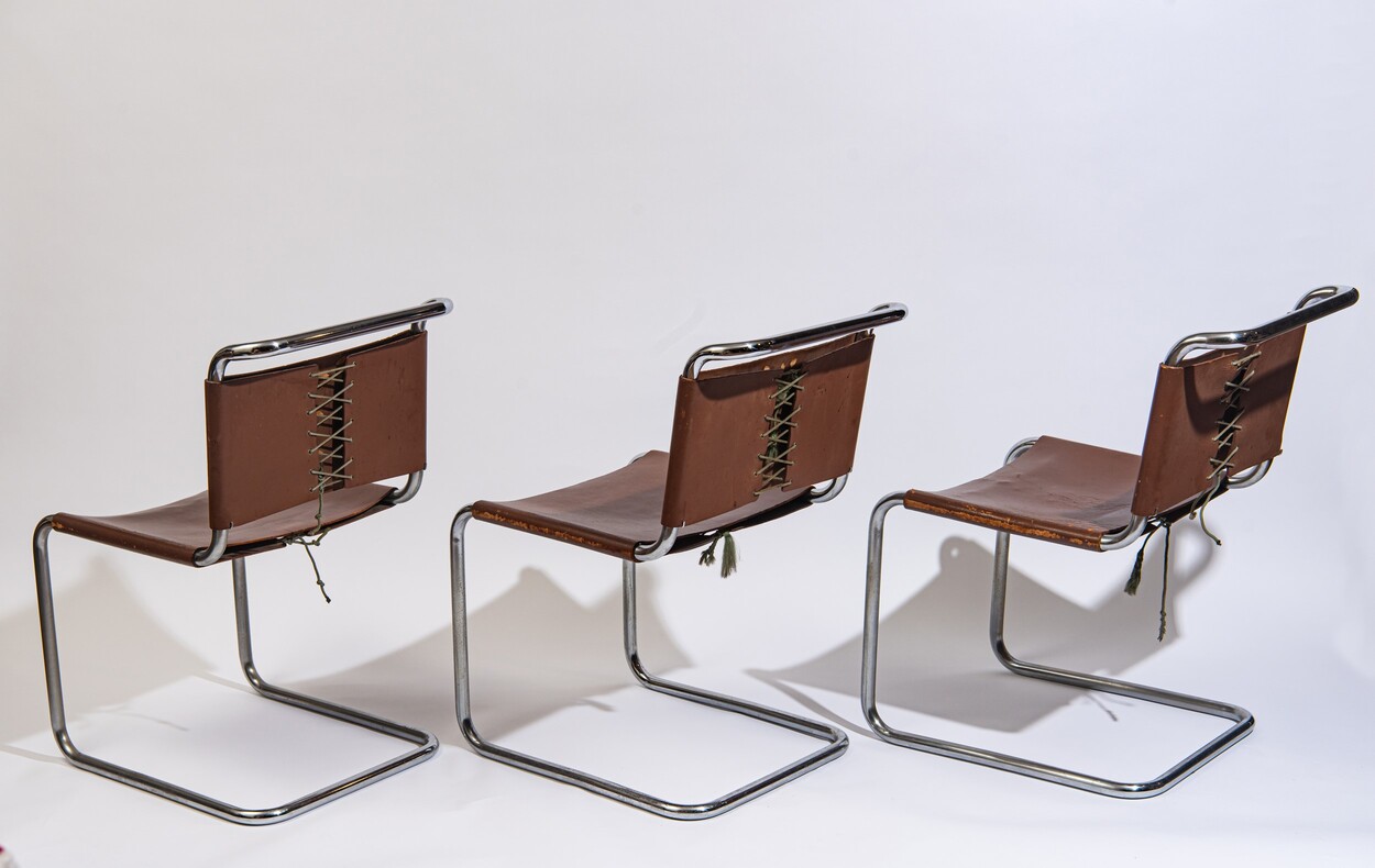 Mart Stam (1899 - 1986) Sei sedie, mod. "S 33" acciaio cromato, cuoio marone...