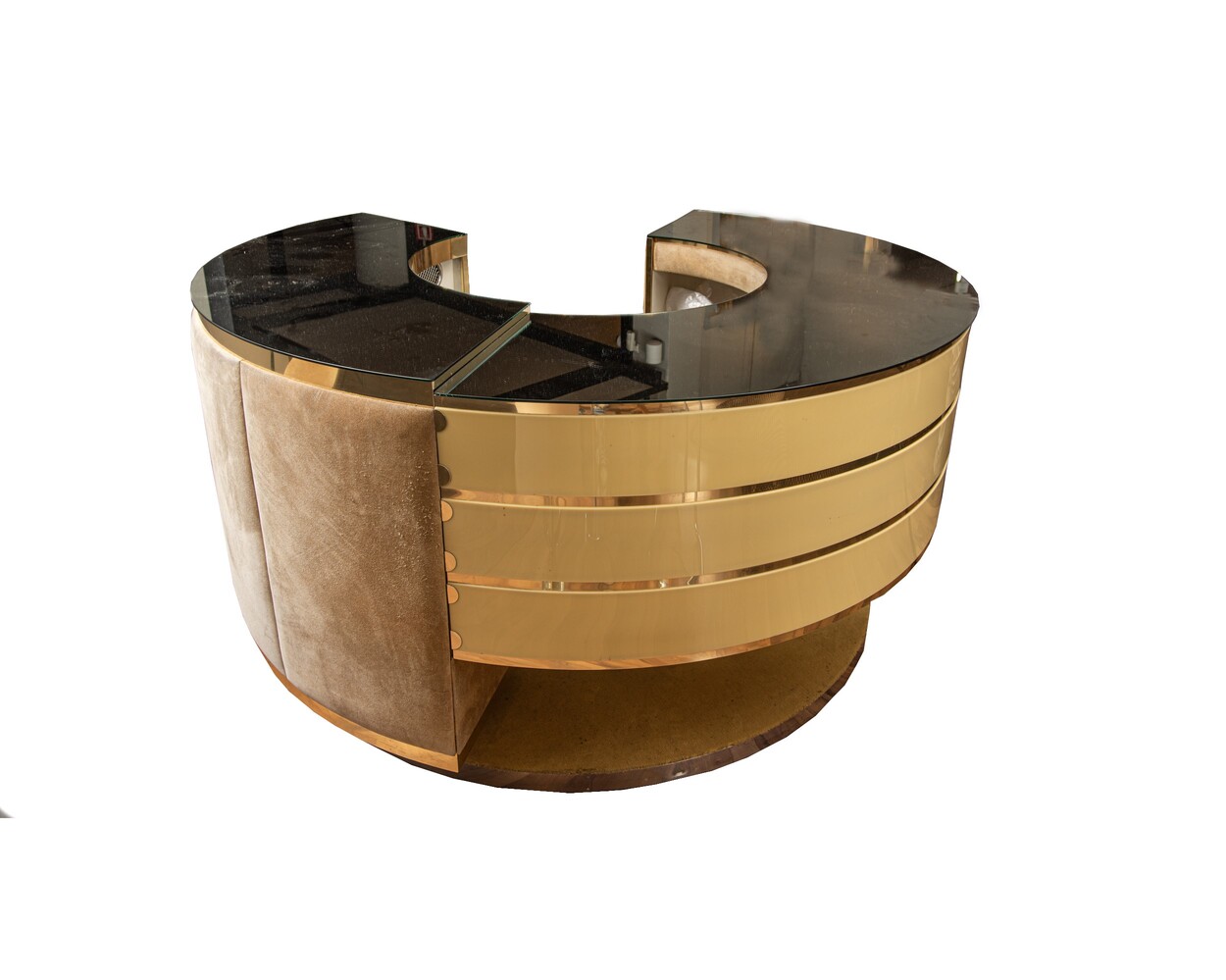 Willy Rizzo (stile di) (1928 - 2013) Mobile Bar con sgabello anni '70 del XX secolo plexiglass, alluminio, ottone e tessuto scamosciato H. 89 x 176 x 176 cm