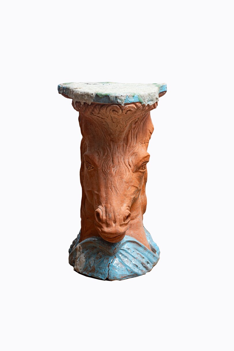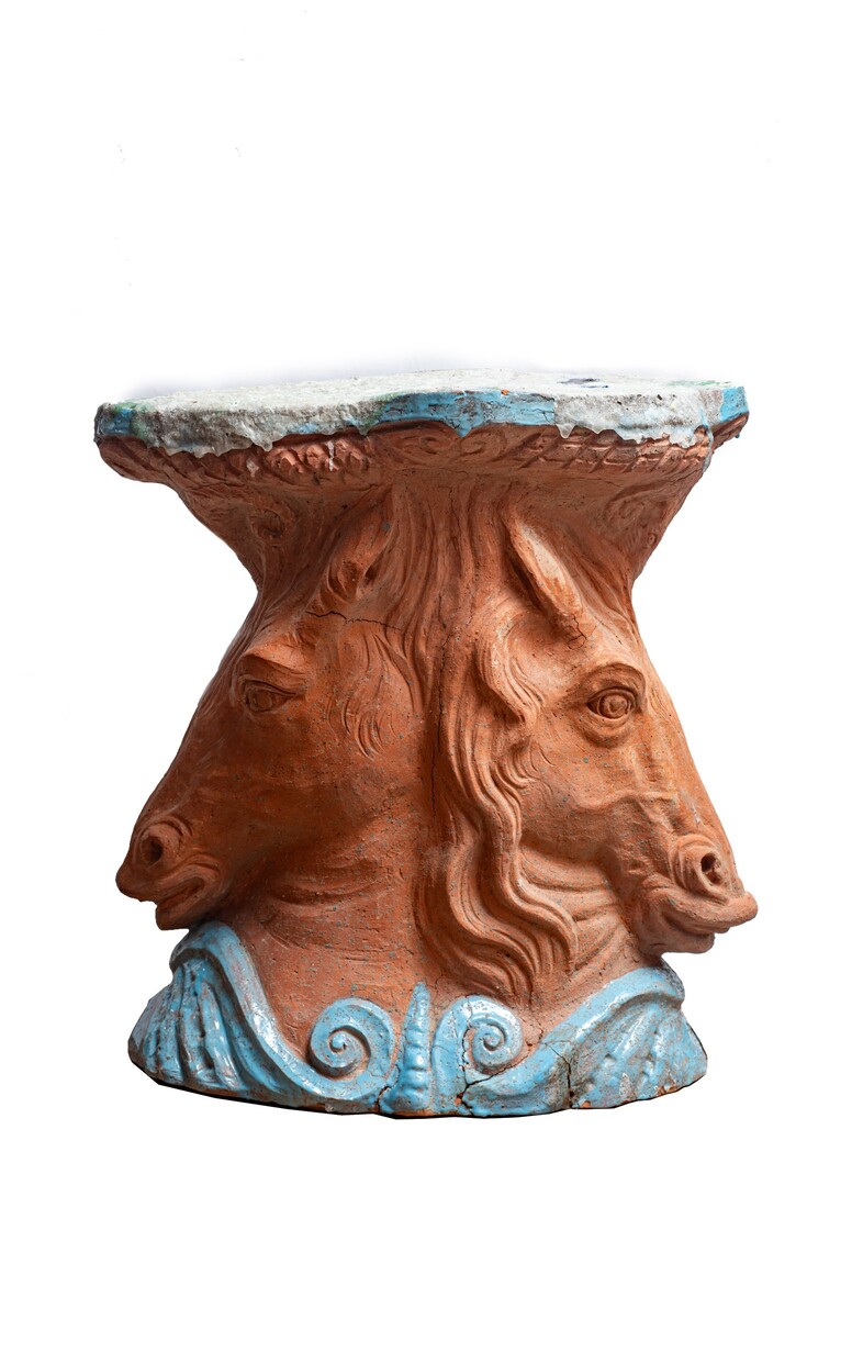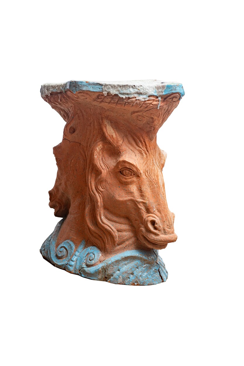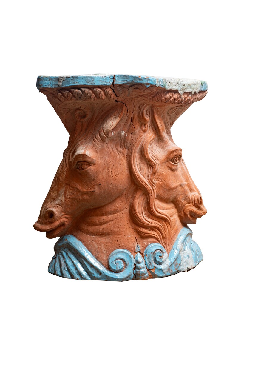 Decorato a teste equine bifronte. Terracotta smaltata di colore azzurro alla base