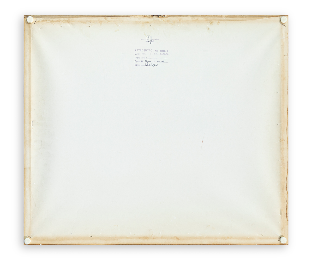 Timbro della Galleria Artecentro (MI), con caratteristiche tecniche dell'opera, al retro del cartoncino protettivo