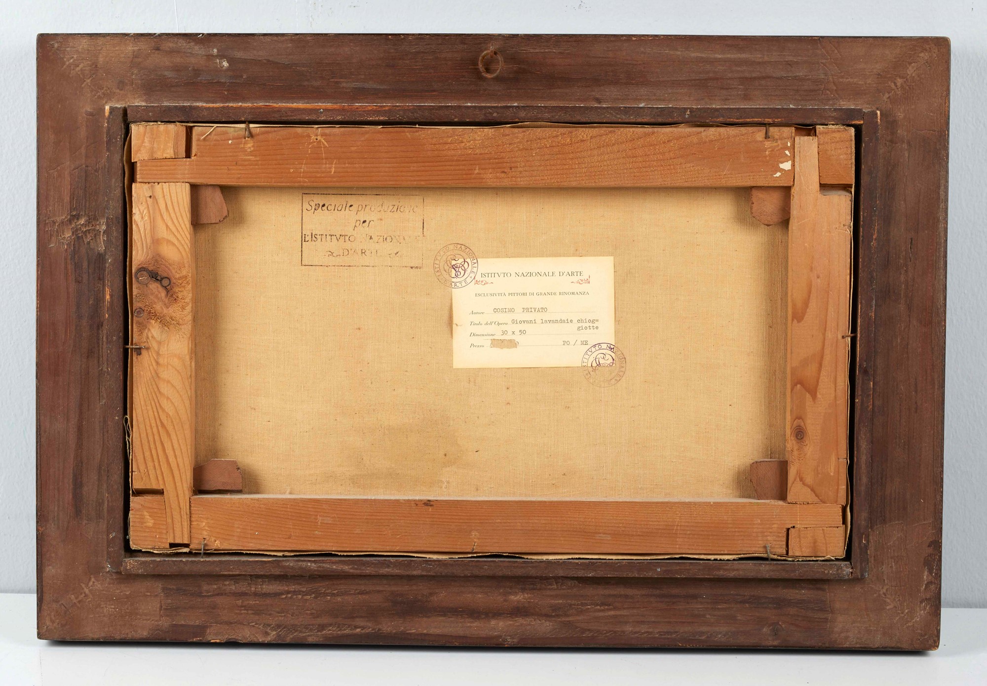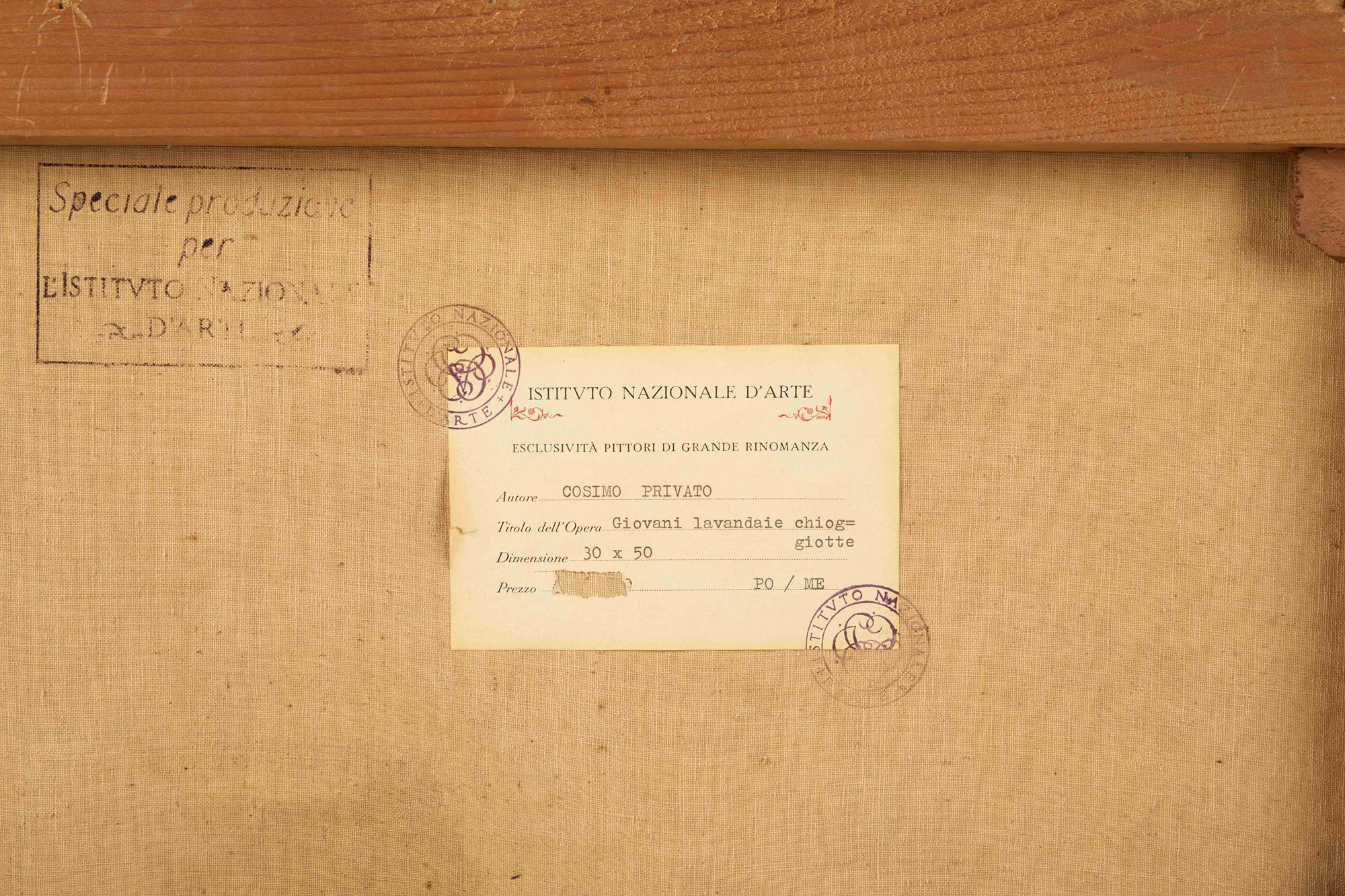 COSIMO PRIVATO (Venezia 1899 - 1971) "Giovani lavandaie chioggiotte". Olio su tela. Cm 30x50. Opera firmata in basso a destra C. Privato. Al retro reca etichetta con timbro Istituto Nazionale d'arte Esclusività pittori di grande rinomanza.