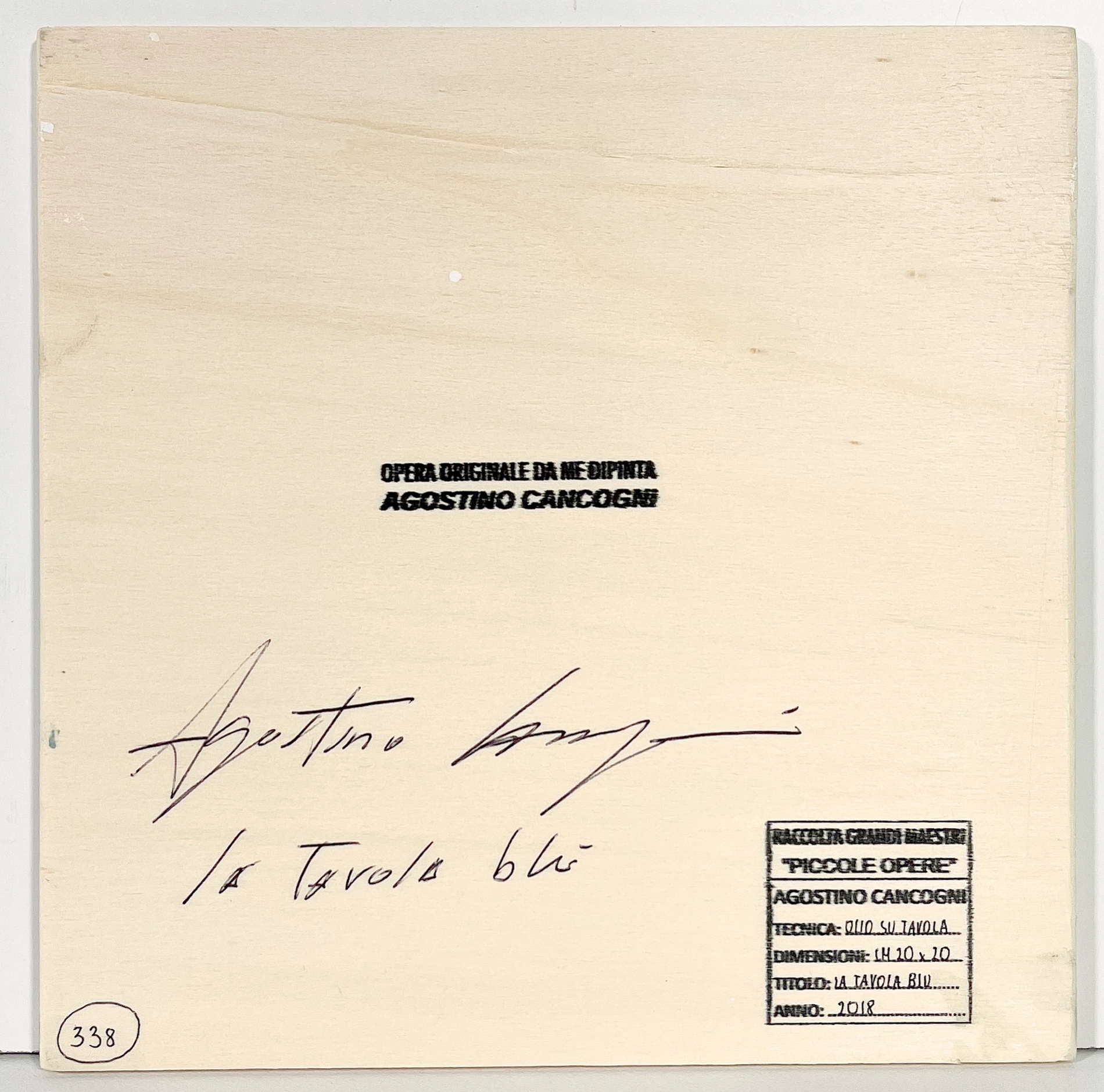 AGOSTINO CANCOGNI, 20 x 20 cm, ”La Tavola Blu" olio su tavola, anno 2018, titolo timbro e firma a retro. Autentica dell'artista su fotografia