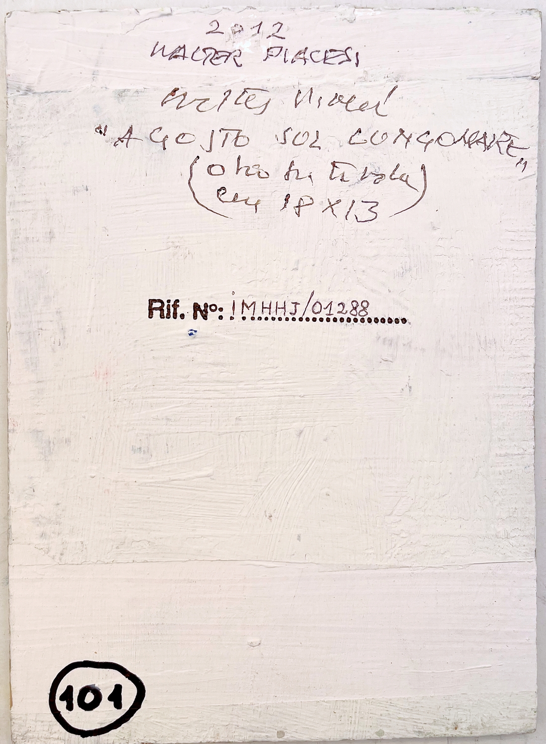 PIACESI WALTER, 18 x 13 cm, ”Agosto sul lungomare" olio su tavola, anno 2012, opera archiviata presso l'archivio Walter Piacesi rif.IMHHJ/01288. Titolo, anno , tecnica dimensioni e numero di archivio a retro. Autentica dell'artista su fotografia