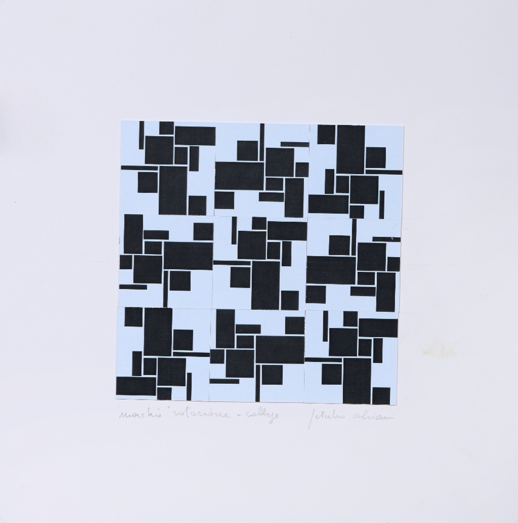 GETULIO ALVIANI, 25 x 25 cm ( collage) 50 x 50 cm carta, Titolo: Rotazione, Collage su carta, scritta e firma in basso: “marchio” rotazione- collage/ Getulio Alviani. Al verso, su un pannello di supporto: timbro Bolzicco Arte, Portogruaro (Ve), con n. 74