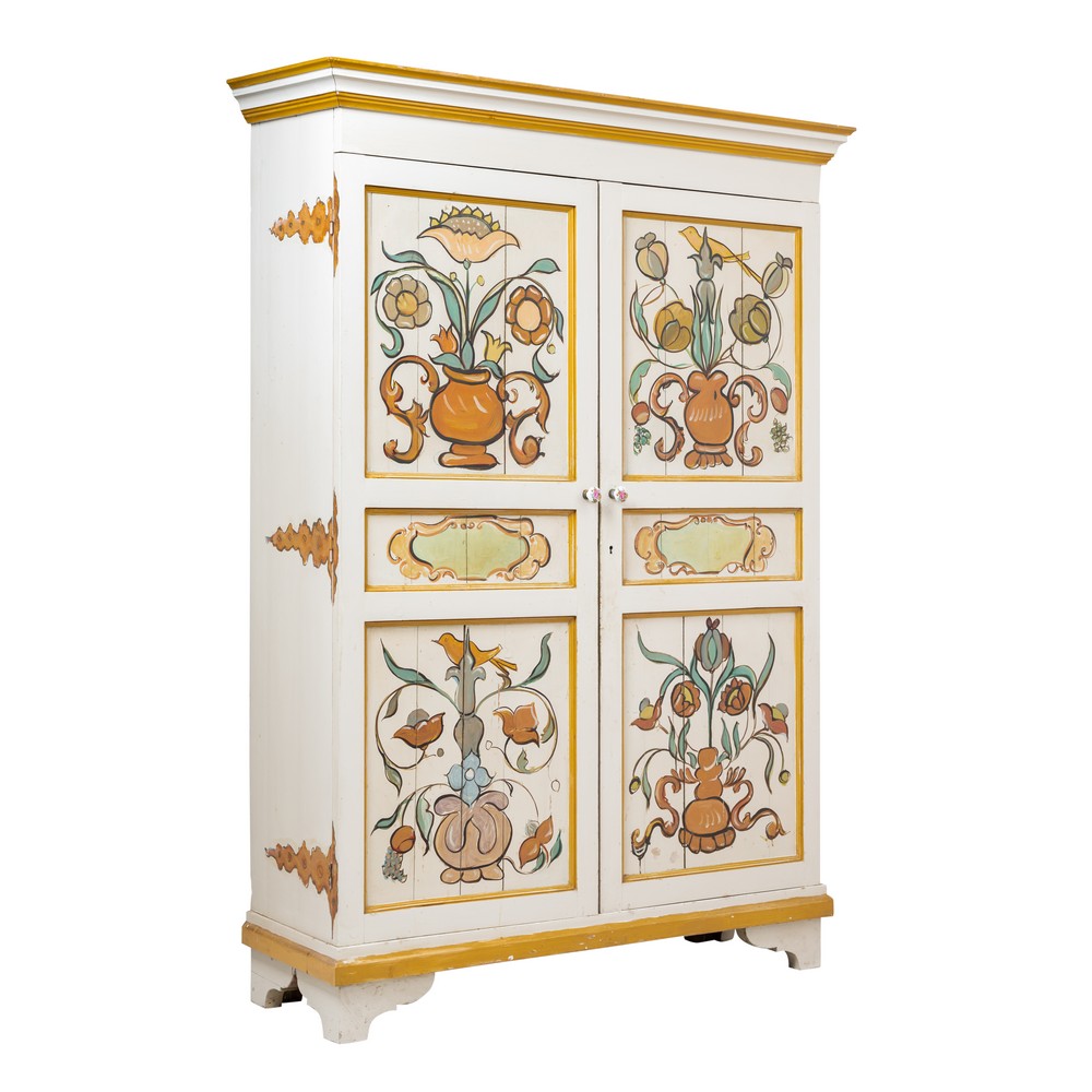 Stipo a due ante con laccature e parte pittorica del XX secolo.