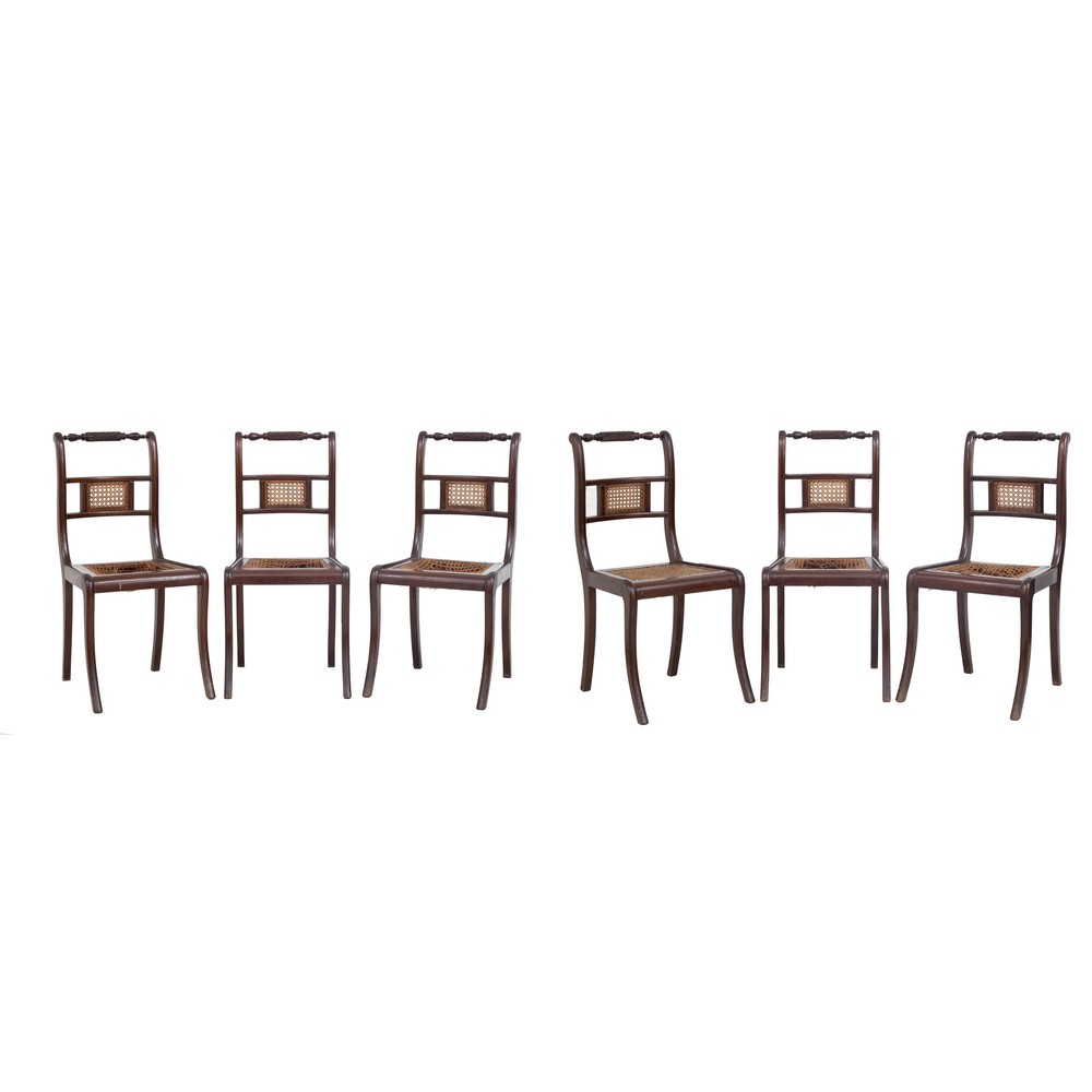 Sei sedie stile Impero in legno di mogano con sedute in paglia di Vienna (da restaurare).