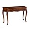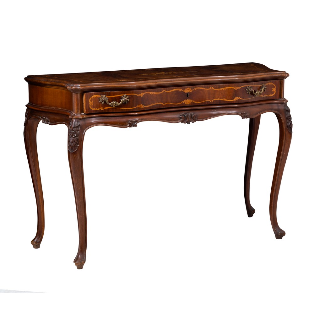 Piccola consolle di gusto barocco in legno di mogano e piuma di mogano, tarsie in bosso, cassetto centrale.