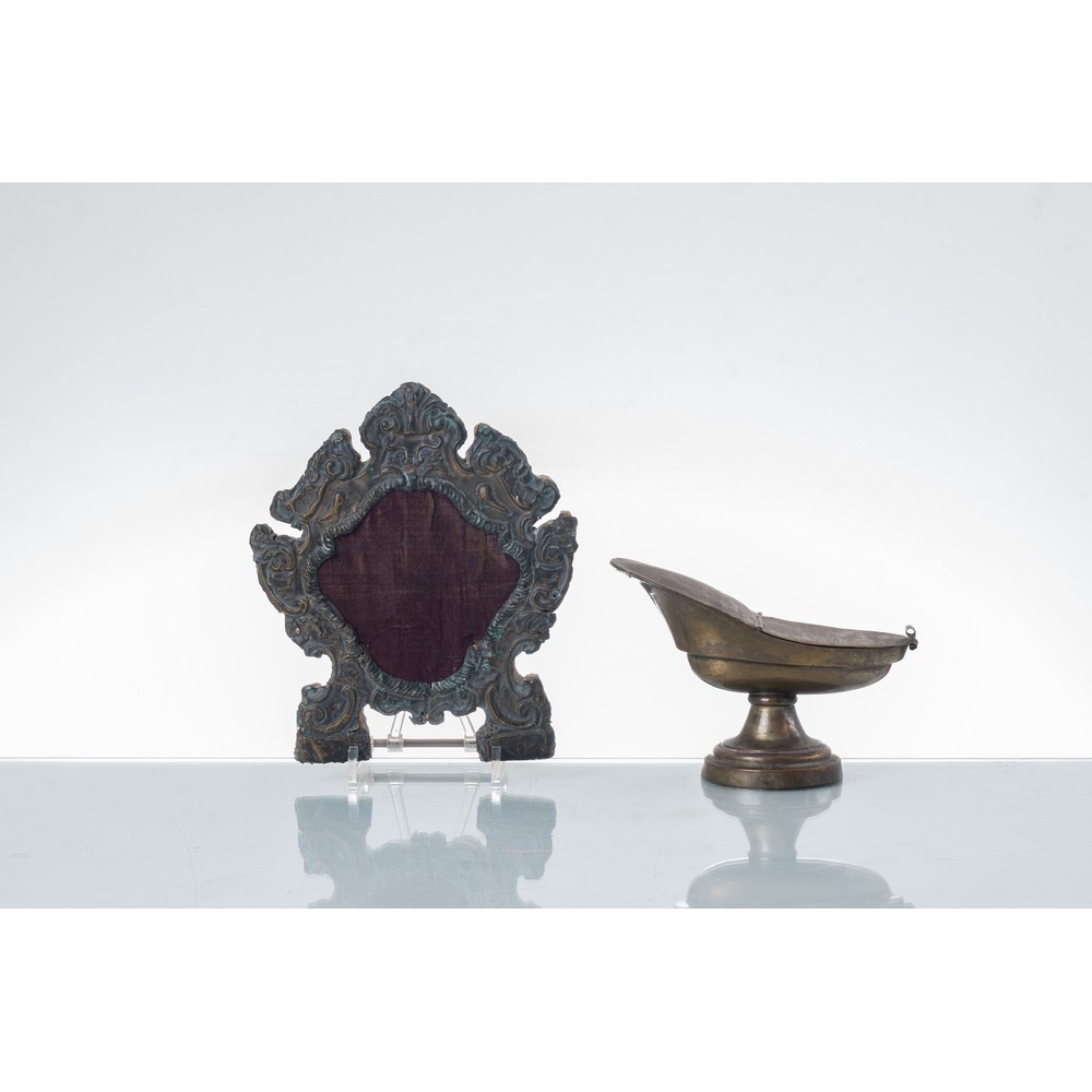 Cartagloria in legno rivestita in metallo sbalzato a mano e navetta in metallo.