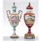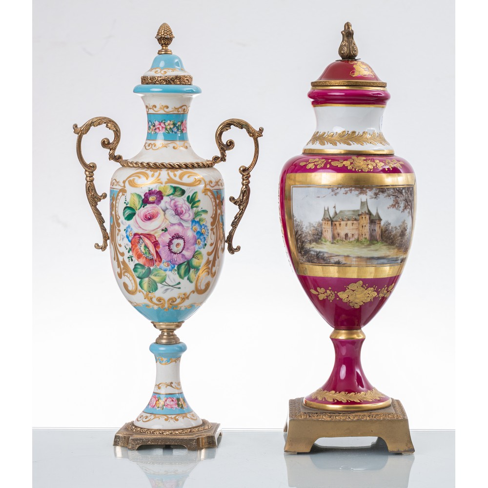 Due potiche in porcellana decorata e dipinta di cui una a motivo floreale ed una con medaglione a motivo paesaggistico.