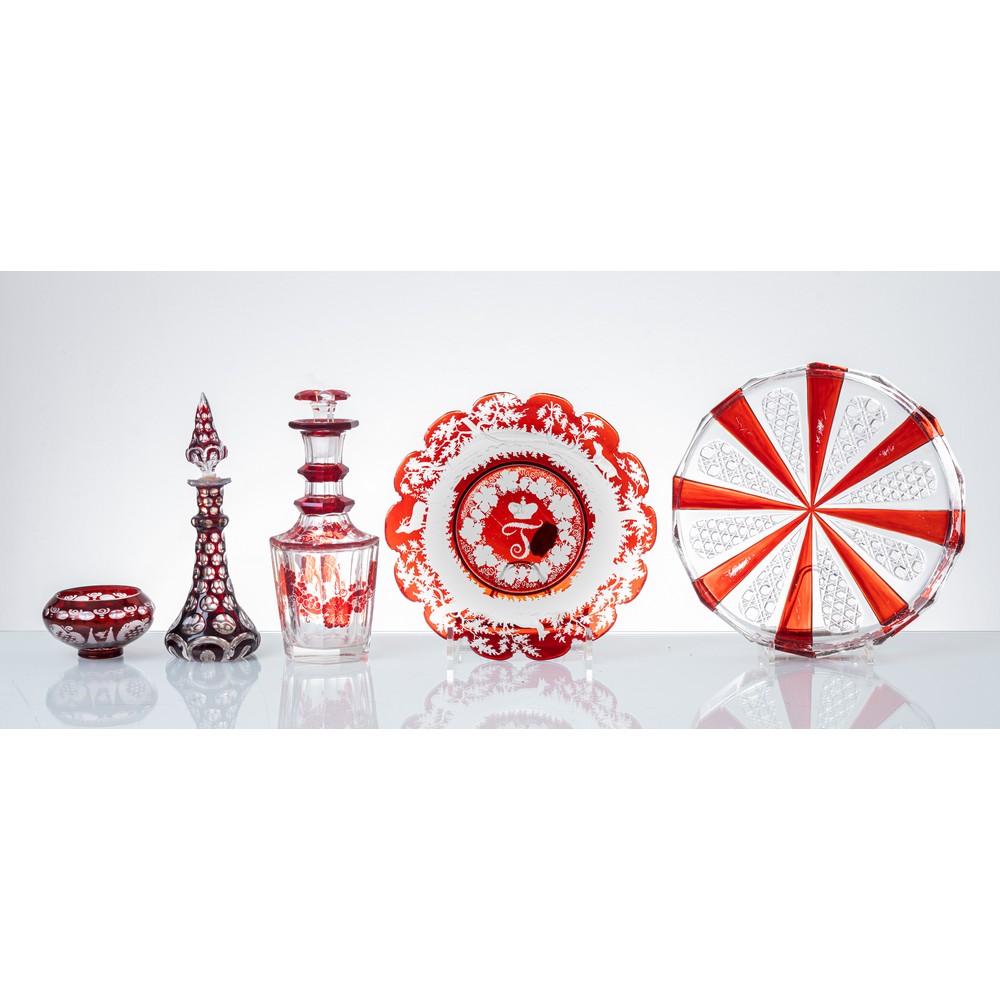 Lotto in vetro nei toni del bianco e del rosso composto da piccolo vassoio, piatto, due bottiglie ed una ciotola (rotture).
