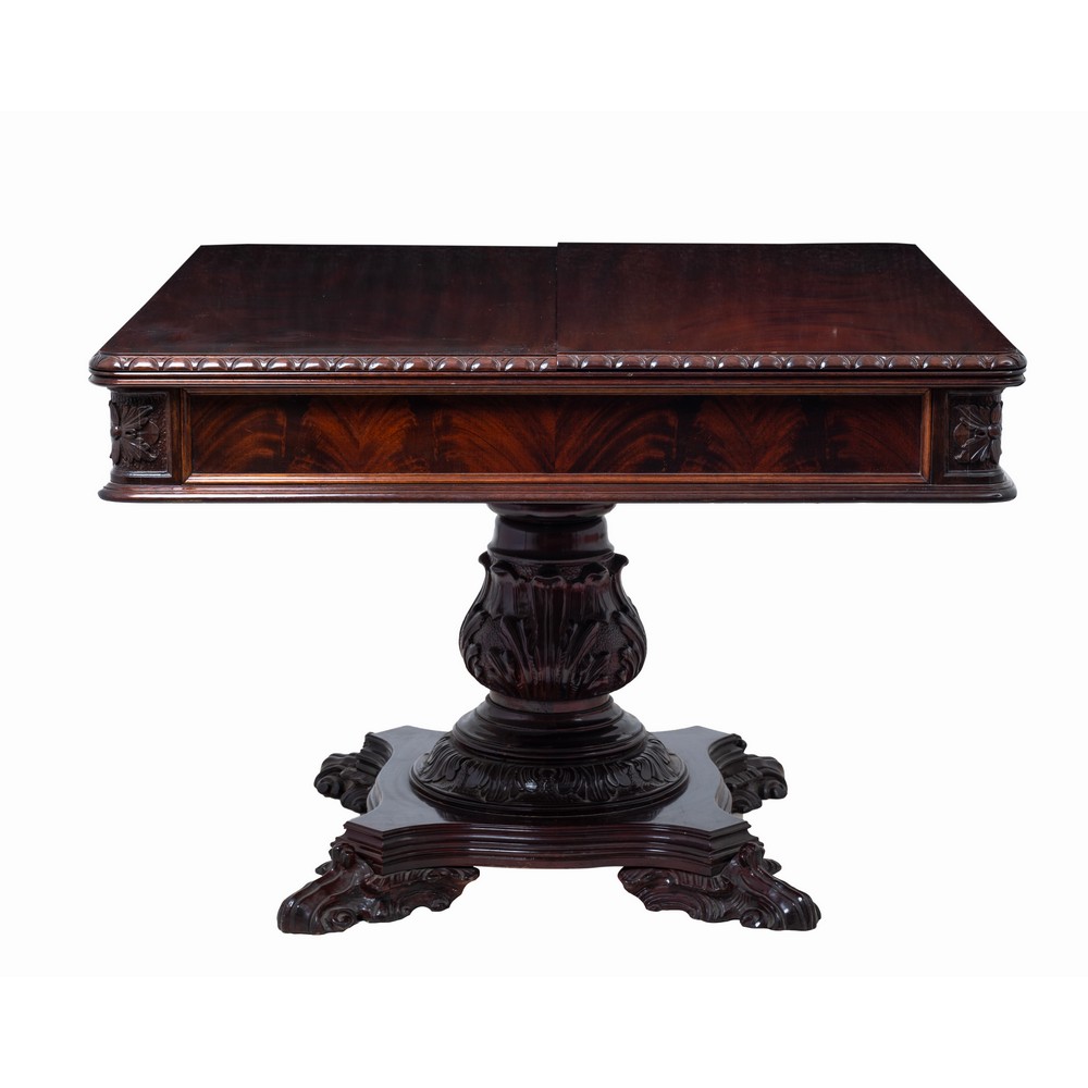 Tavolo stile Luigi Filippo in legno di mogano e piuma di mogano, allungabile a libro.