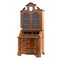 Trumeau di gusto settecentesco con tre cassetti e ribalta nella parte sottostante, due ante a vetro nella parte superiore in legno di noce e radica di tuja, perfili in bosso e legno esotico.