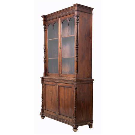 Grande credenza con vetrina doppio corpo a due ante nella parte sottostante, due ante a vetri nella parte sovrastante in legno di abete.