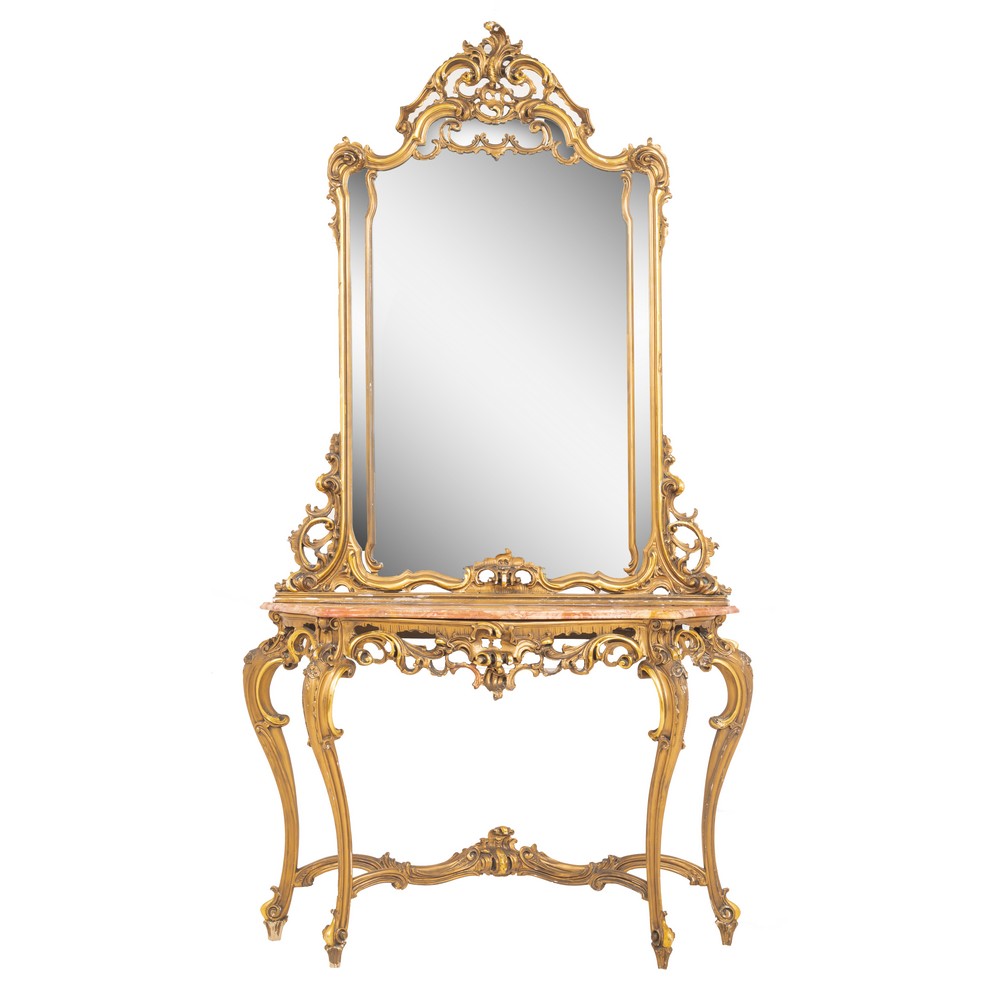 Consolle con specchiera di gusto barocco in legno dorato, piano in marmo rosso venato.