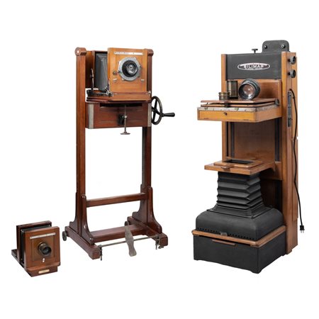 Due macchine fotografiche con supporto in legno regolabile e vari obbiettivi ed un ingranditore fotografico "Silimar Siluro Tortona".