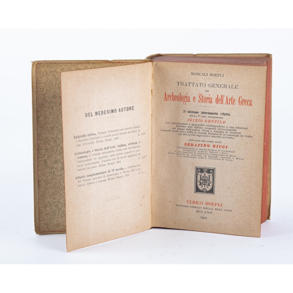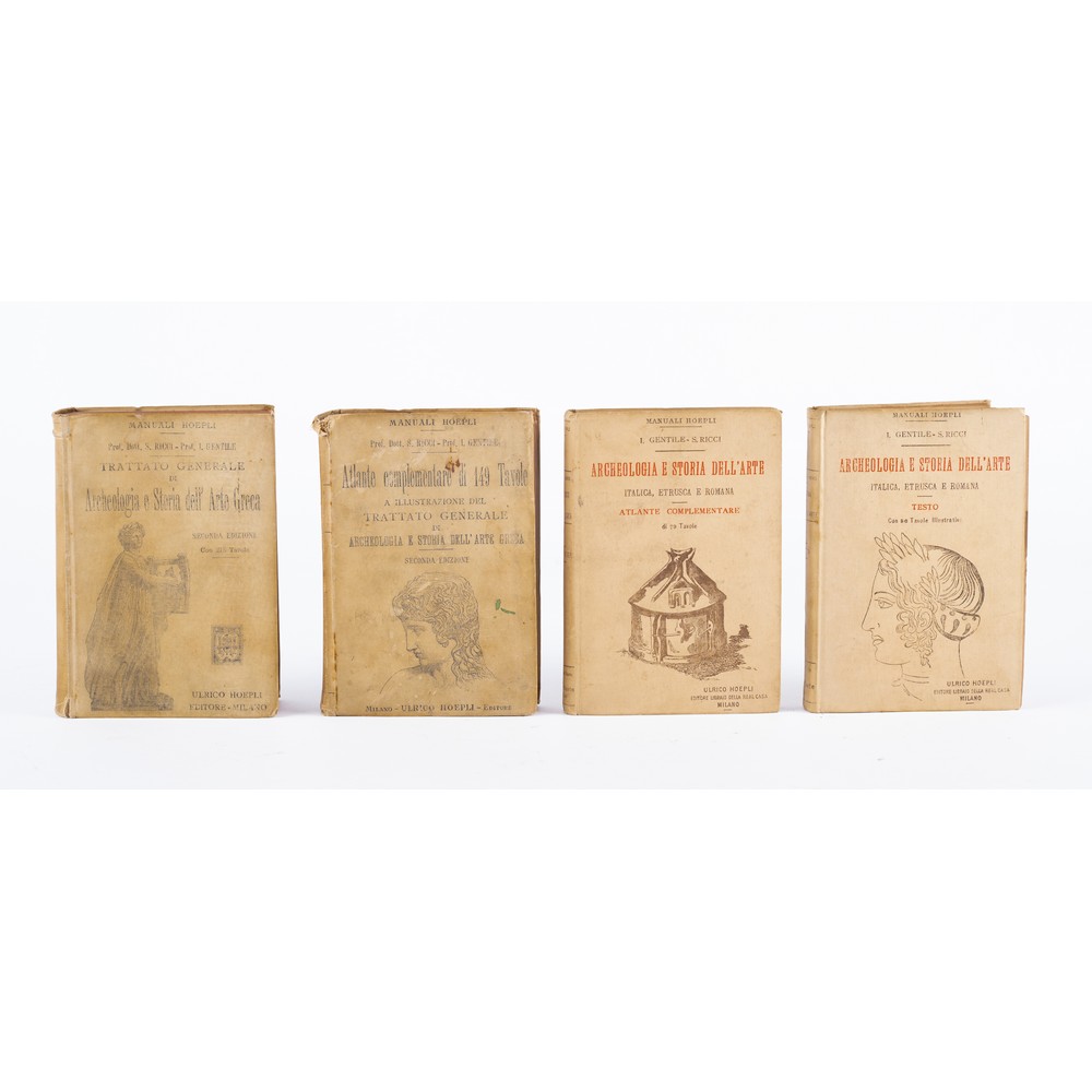 QUATTRO VOLUMI DELLE EDIZIONI HOEPLI: 1) Iginio Gentile / Serafino Ricci TRATTATO GENERALE ARCHEOLOGIA E STORIA DELL’ARTE ITALICA, ETRUSCA E ROMANA, 1901. Due volumi suddivisi in Testo e Atlante. Legature editoriali con impressioni ai piatti e titoli ai piatti e ai dorsi. Tagli colorati. In discrete condizioni. Volume Testo Pp. 346, 64 con una tavole più volte ripiegata. Volume Atlante pp. 222 tavole LXXIX, 64. 2) Iginio Gentile / Serafino Ricci TRATTATO GENERALE DI ARCHEOLOGIA E STORIA DELL’ARTE GRECA, 1905. Due volumi suddivisi in Testo e Atlante. Legature editoriali con impressioni ai piatti e titoli ai piatti e ai dorsi. Tagli colorati. In discrete condizioni. Volume Testo Pp. 270 con 213 tavole intercalate nel testo. Volume Atlante pp. 225 tavole CXLIX, 64.