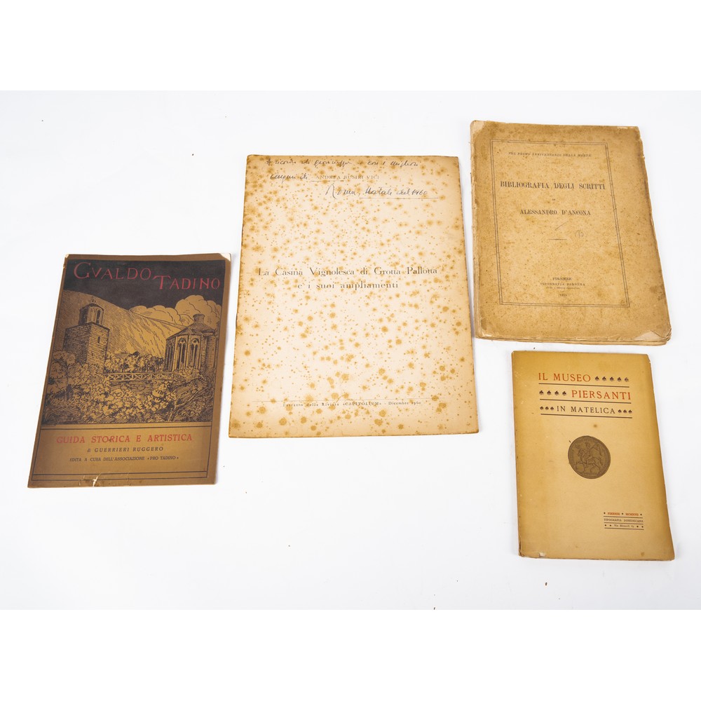 QUATTRO OPUSCOLI DI VARIA DEI PRIMI DEL ‘900: 1) BIBLIOGRAFIA DEGLI SCRITTI DI ALESSANDRO D’ANCONA, ed. Firenze, Barbera 1915. In 8° grande. Brossura editoriale. In antiporta ritratto fotografico di Alessandro D’Ancona protetto da velina. Pubblicazione realizzata in occasione del primo anniversario della morte. Segni d’uso alla brossura ma pagine in ottimo stato di conservazione. Pp. 104. 2) Andrea Busiri Vici LA CASINA VIGNOLESCA DI GROTTA PALLOTTA E I SUOI AMPLIAMENTI, ed. Capitolium 1960. In folio. Brossura editoriale. Con dedica dell’autore. In ottime condizioni. Pp. 12. Con dedica autografa dell’autore. 3) Ruggieri Ruggero GUIDA STORICA DI GUALDO TADINO, ed, Pro Tadino Anno XVI. In 8°. Brossura editoriale. Pagine in ottime condizioni. Pp. 29.4) Sennen Bigiaretti IL MUSEO PIERSANTI IN MATELICA, ed. Firenze, Tipografia Domenicana 1917. In 16° grande. Brossura editoriale illustrata e tagli marginosi. Piccole usure d’uso ma pagine in ottime condizioni. Pp. 40.