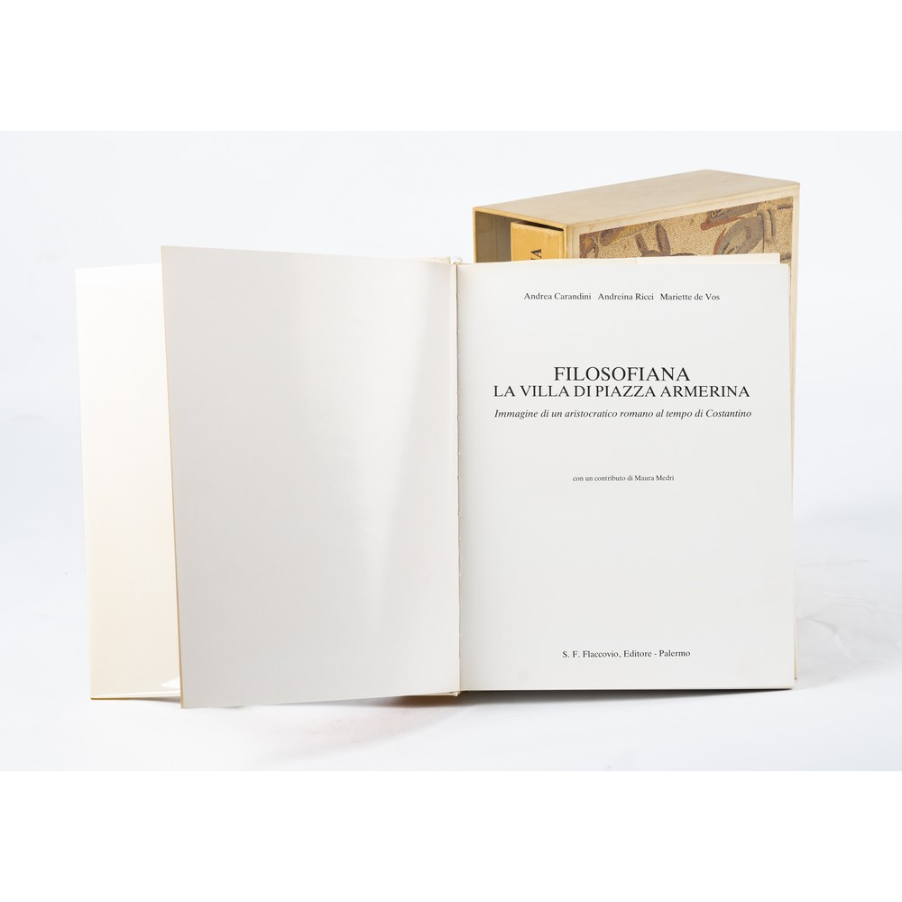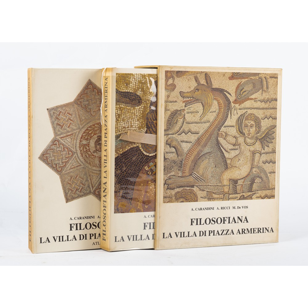 Andrea Carandini / Andreina Ricci / Mariette De Vos FILOSOFIANA. LA VILLA DI PIAZZA ARMERINA, ed. S. F. Flaccovio, Palermo 1982. Due volumi in cofanetto . Cm. 30 x 23. Si tratta di un volume di testo di pp. 414 con 232 illustrazioni in bianco e nero e a colori nel testo e 3 tavole fuori testo e di un Atlante, con 65 tavole sciolte a colori e in bianco e nero, più volte ripiegate, che illustrano le strutture, i pavimenti e le decorazioni parietali. In ottime condizioni.