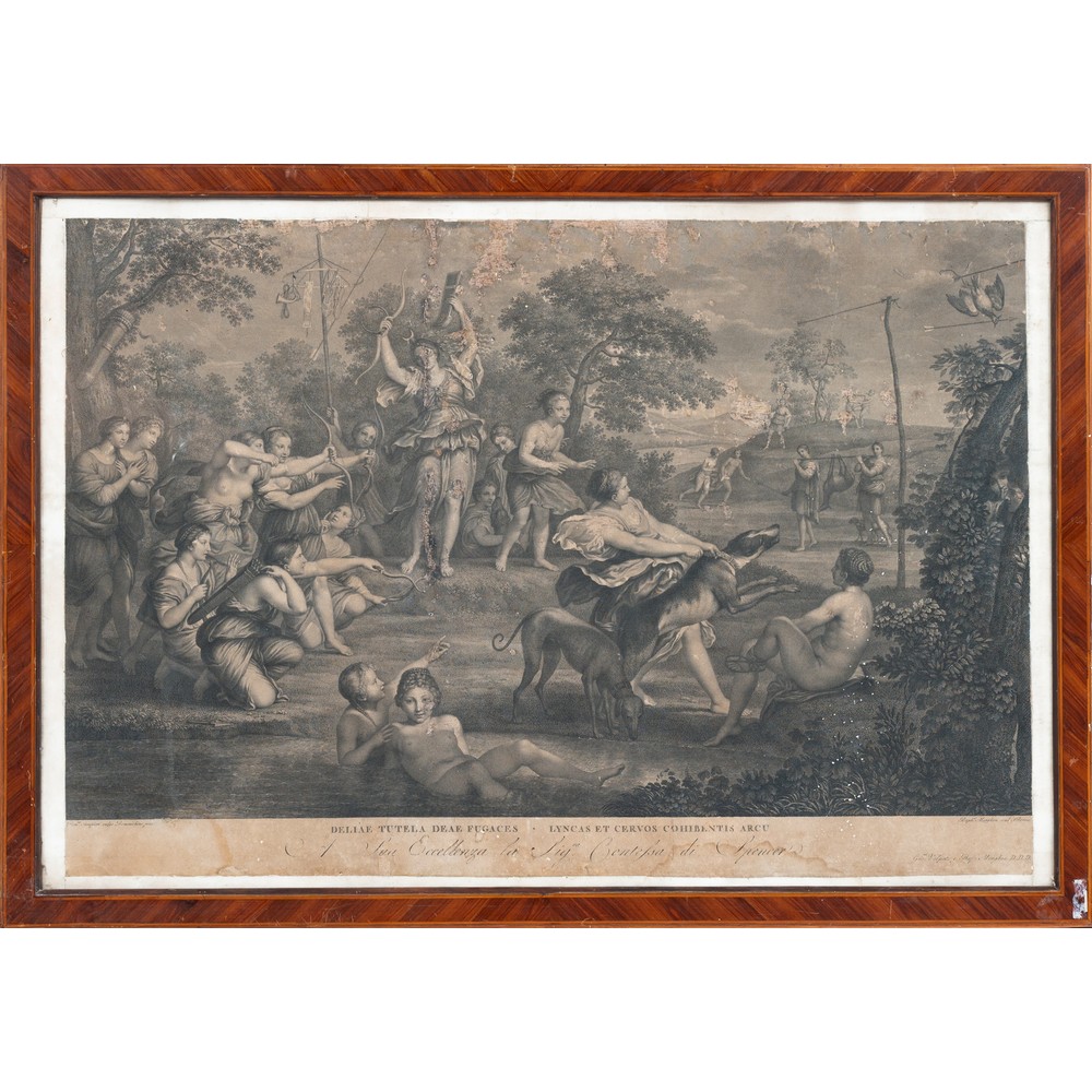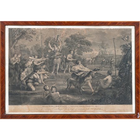 Incisione raffigurante "Diana cacciatrice con le ninfe" entro cornice (usure).