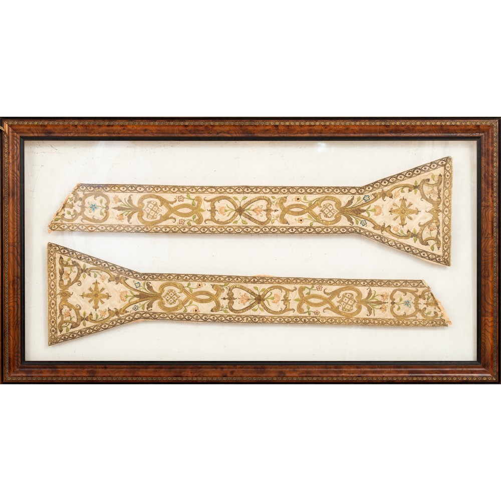 Stola in seta riccamente ricamata a fili dorati entro cornice.