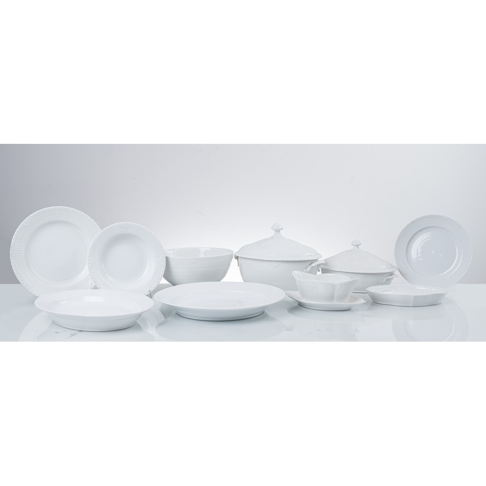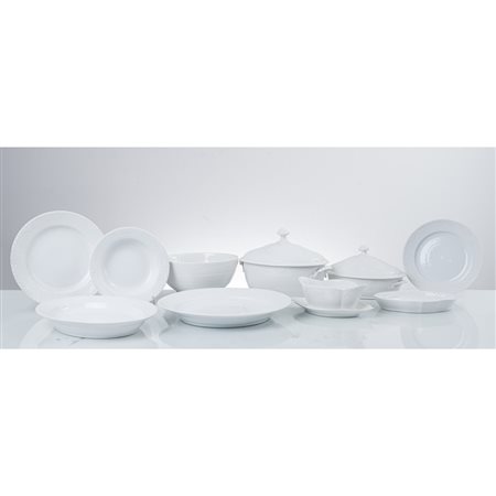 Servizio di piatti in porcellana bianca composto da: zuppiera, legumiera, 5 piatti da portata ovali, 3 piatti da portata rotondi, insalatiera, 2 raviere, salsiera, 69 piatti piani, 33 piatti fondi, 33 piatti frutta.