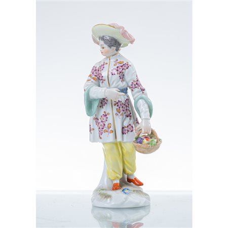 Scultura in porcellana decorata e dipinta raffigurante "Figura femminile con cesto".