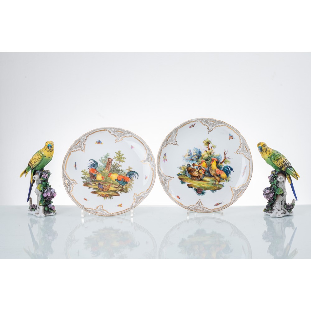 Coppia di piatti Vienna in porcellana decorata e dipinta e coppia di sculture in porcellana Capodimonte dipinta e decorata raffiguranti "Pappagalli" (usure e mancanze).