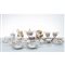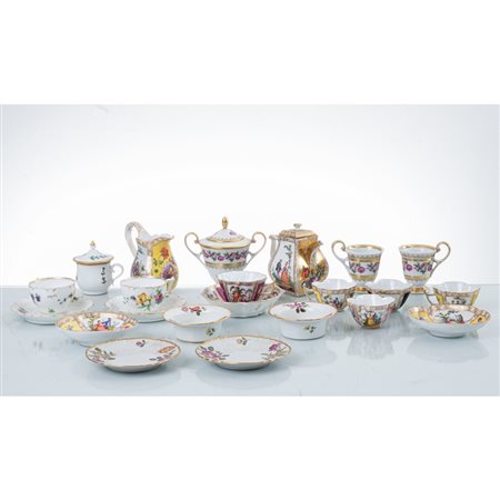 Lotto in porcellana dipinta e decorata con lumeggiature in oro composto da due tazzine con piattino, zuccheriera, due parti marmellate con piattini, tazzina con coperchio, caffettiera, lattiera, due ciotoline, tazzina con piattino, due tazzine e due tazzine con piattino (difetti e mancanze).