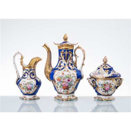 Parte di servizio Luigi Filippo in porcellana Vecchia Parigi decorata e dipinta nei toni del blu con decori a motivo floreale composto da caffettiera, lattiera e zuccheriera, lumeggiature in oro (usure).