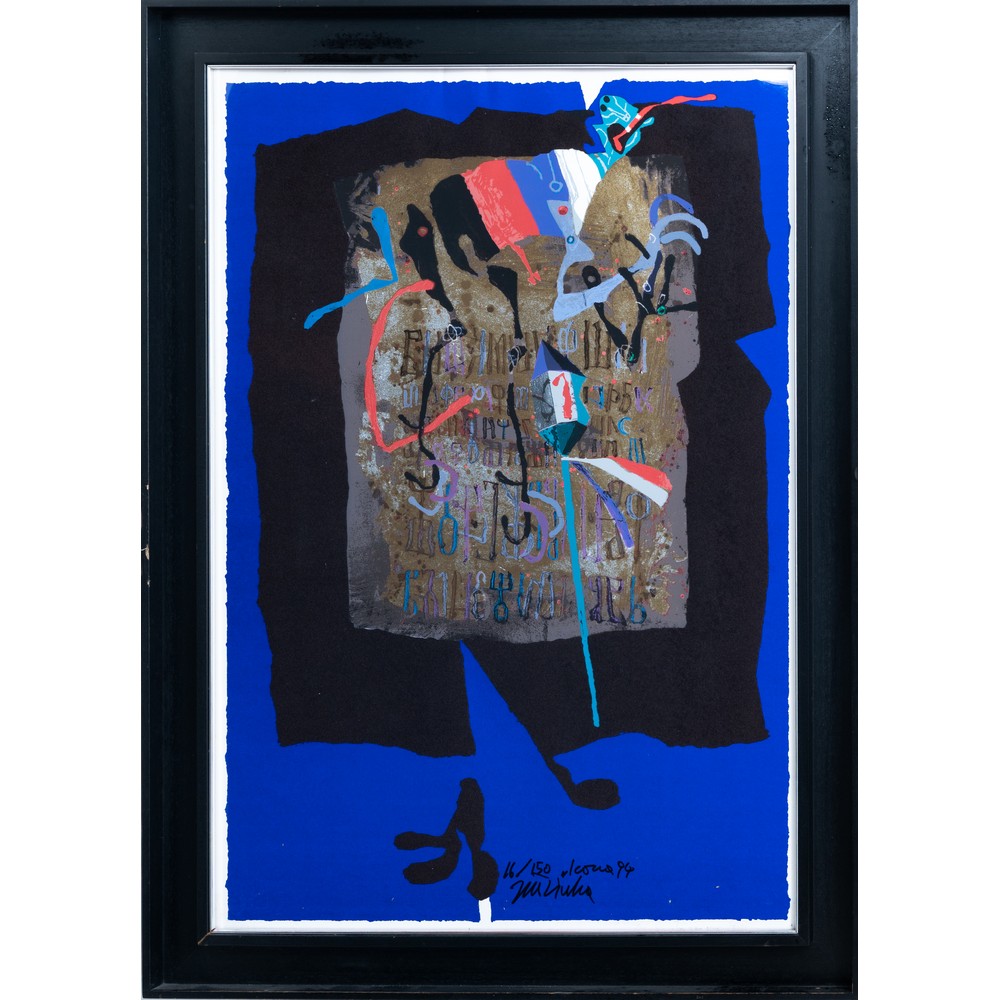 Serigrafia a colori, flocage nero, oro e argento, es. 16/150