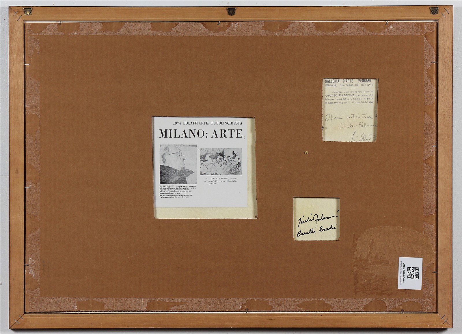 FALZONI GIULIO (1900 - 1978) Inseguimento d'amore. Acquerello su carta. Cm 35,00 x 55,00. Firma in basso a destra. Al retro firma e titolo e cartiglio per autentica galleria d'arte Pedrani, Lignano. Cornice presente
