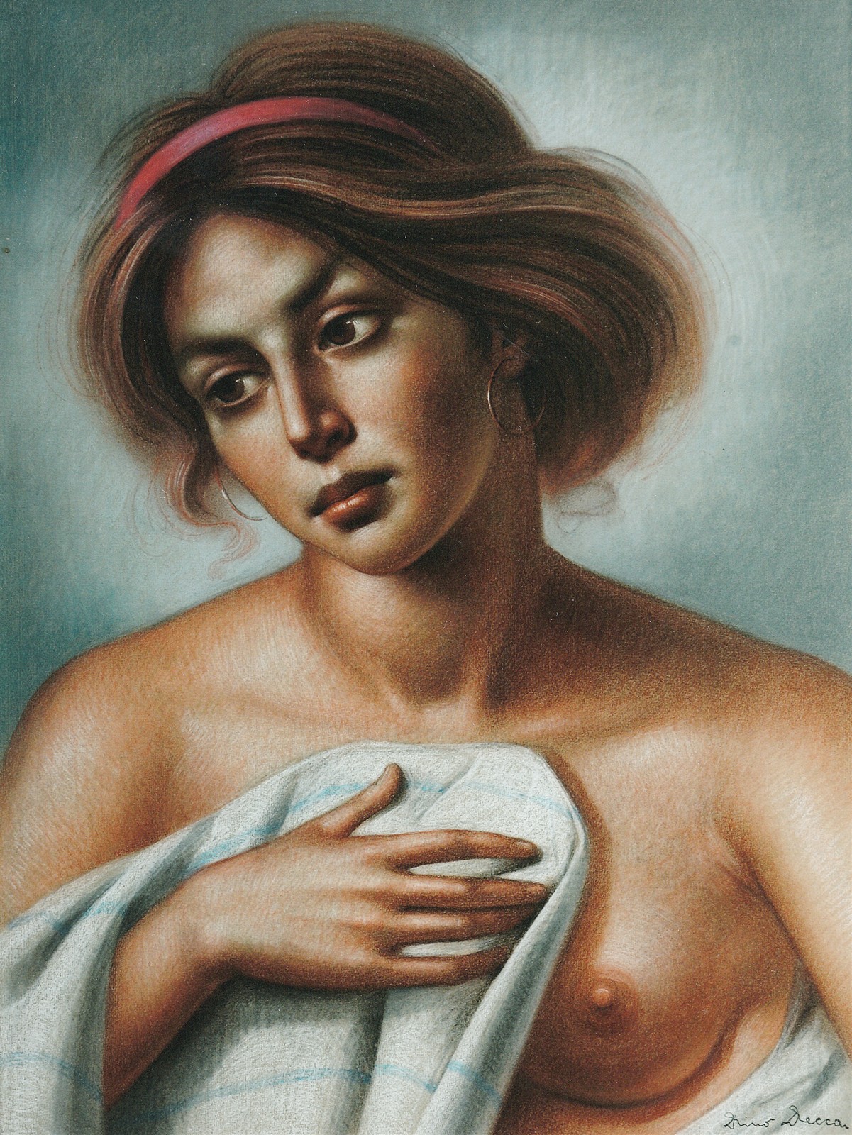 DECCA DINO (1935 - 2005) Busto di modella con nastro rosa. Pastello su carta....