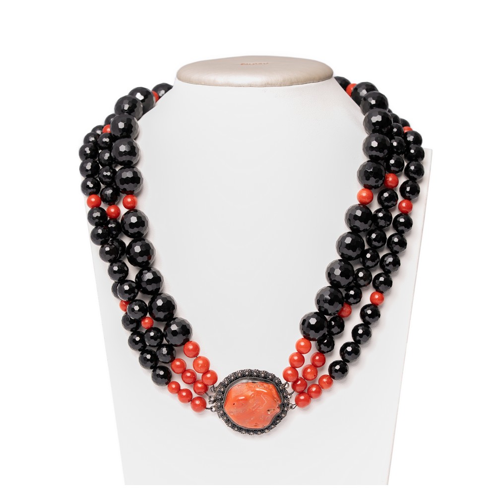 COLLANA a tre fili di sfere di corallo e onice sfaccettato, susta in argento sbalzato e corallo (g. 234)