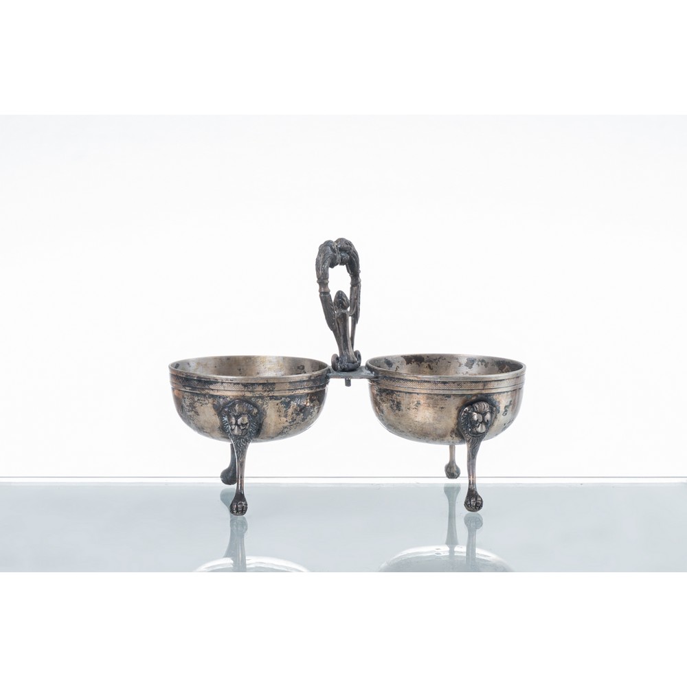 Saliera a doppia vaschetta in argento, piedi a zampa leonina, presa a guisa di teste feline (g. 235).